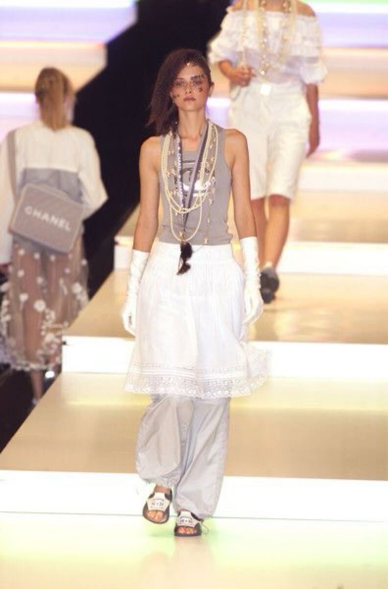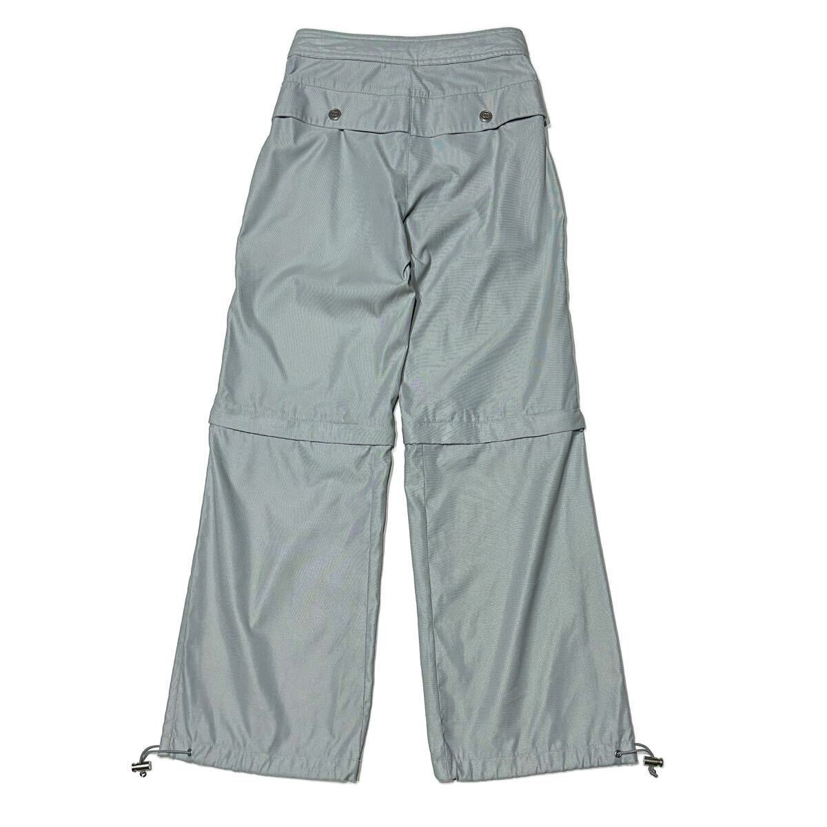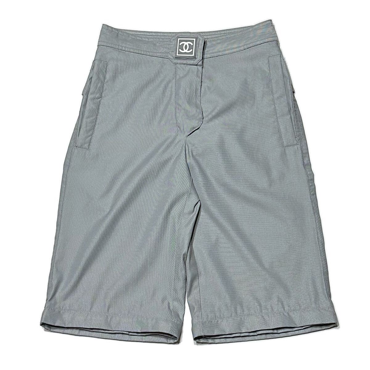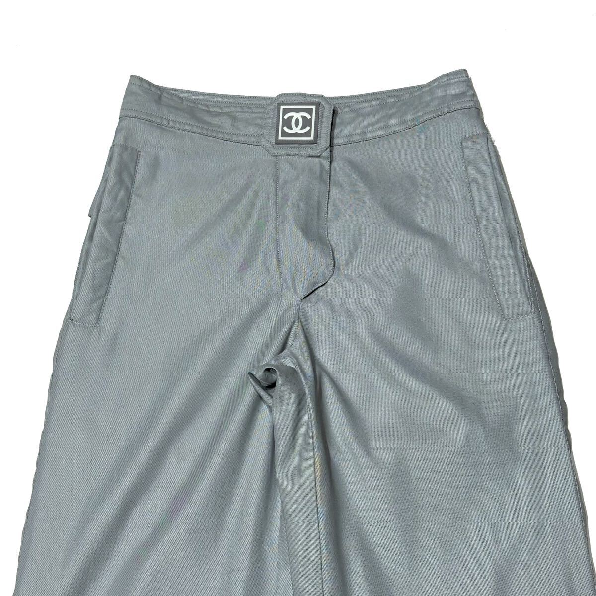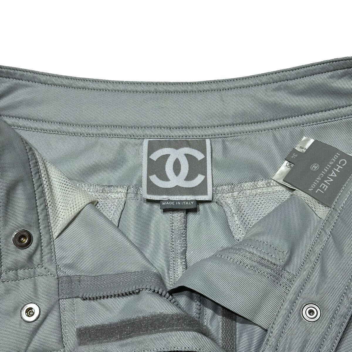 ウエスト中央に大きなココマーク入りタブ バックポケットはロゴ入りスナップボタン付き、 裾ドローコードの金具にもココマーク刻印入り 膝部分で着脱可能なジップオフ仕様(ショーツにもなる2WAYデザイン) メッシュ裏地付きで通気性も良好 90s〜2000sのCHANELスポーツライン黄金期を象徴するような、実用性とラグジュアリーを兼ね備えた一本。