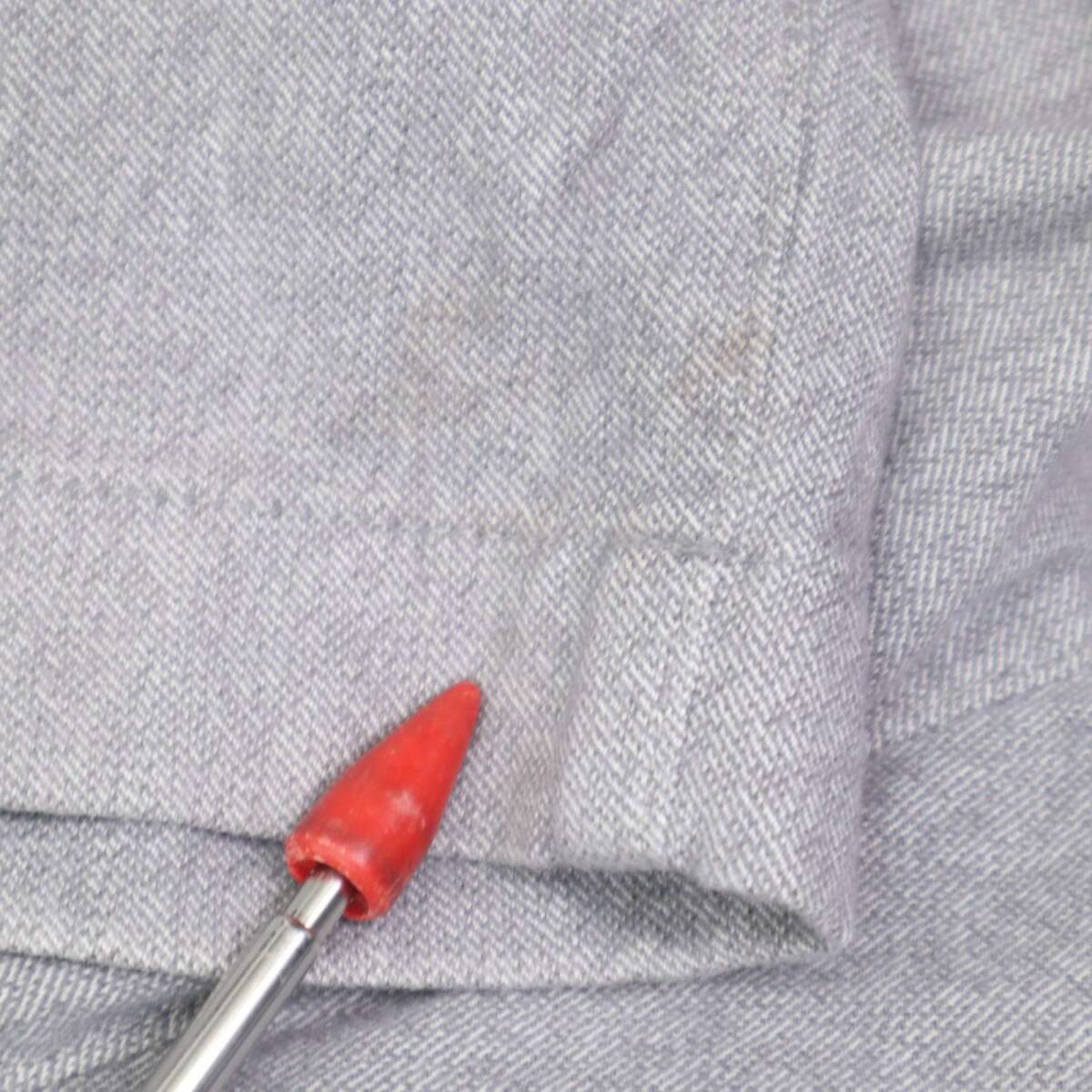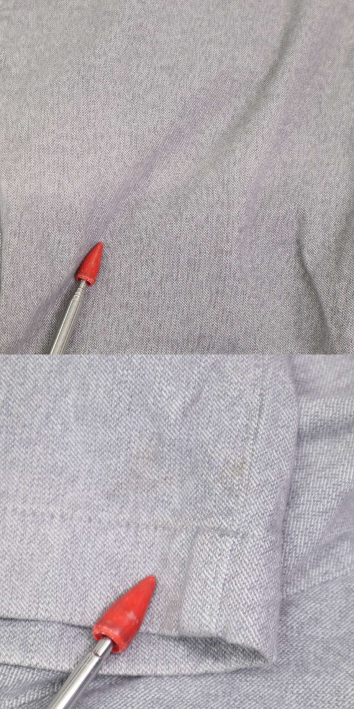 右太ももにごく薄い変色と右裾にごく薄い汚れがございます。着用に問題はございません。