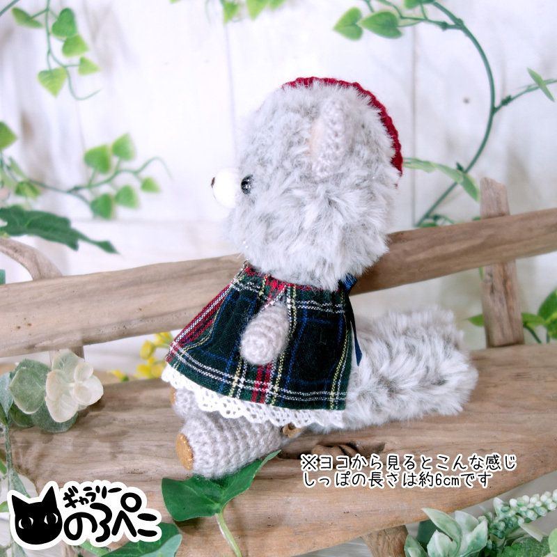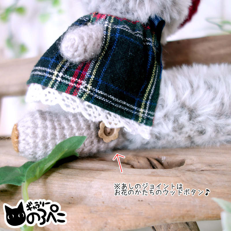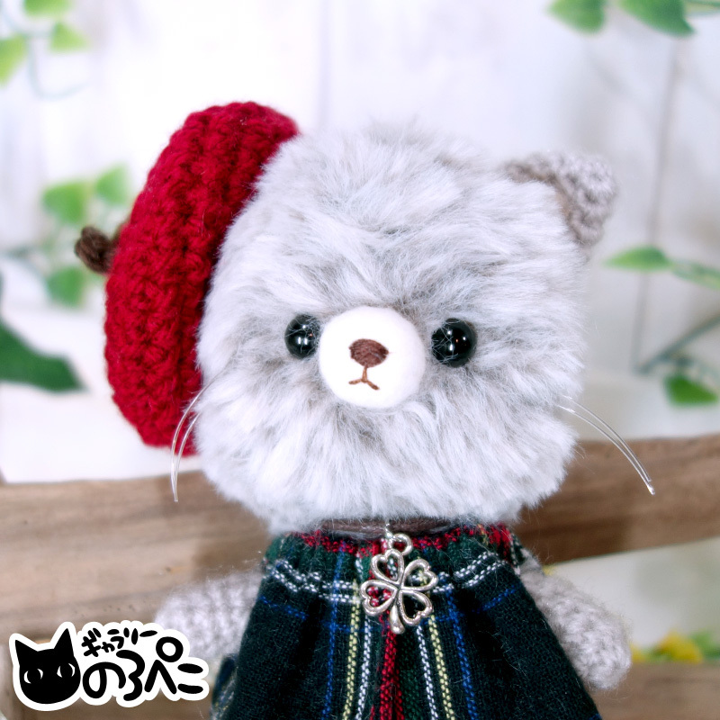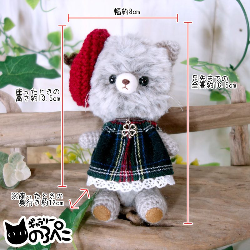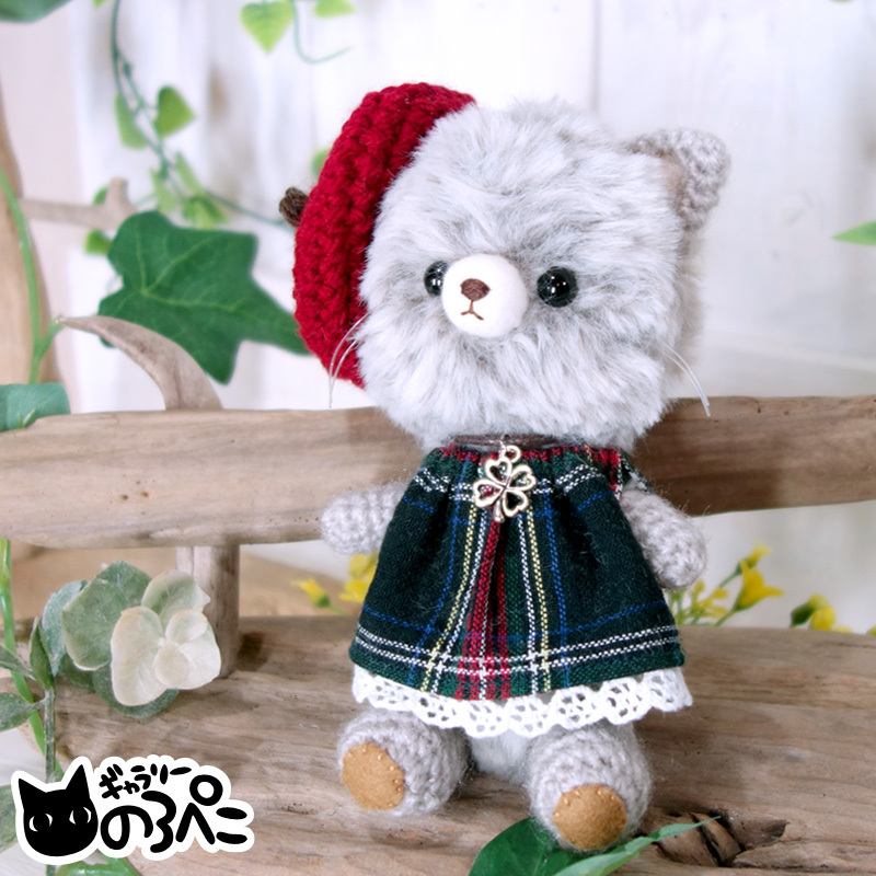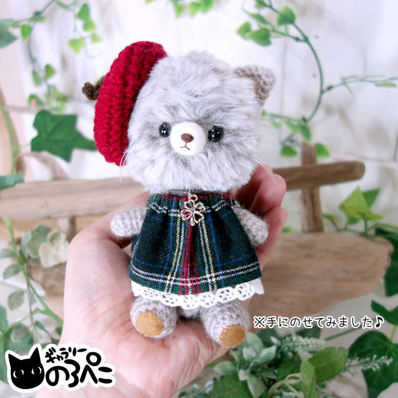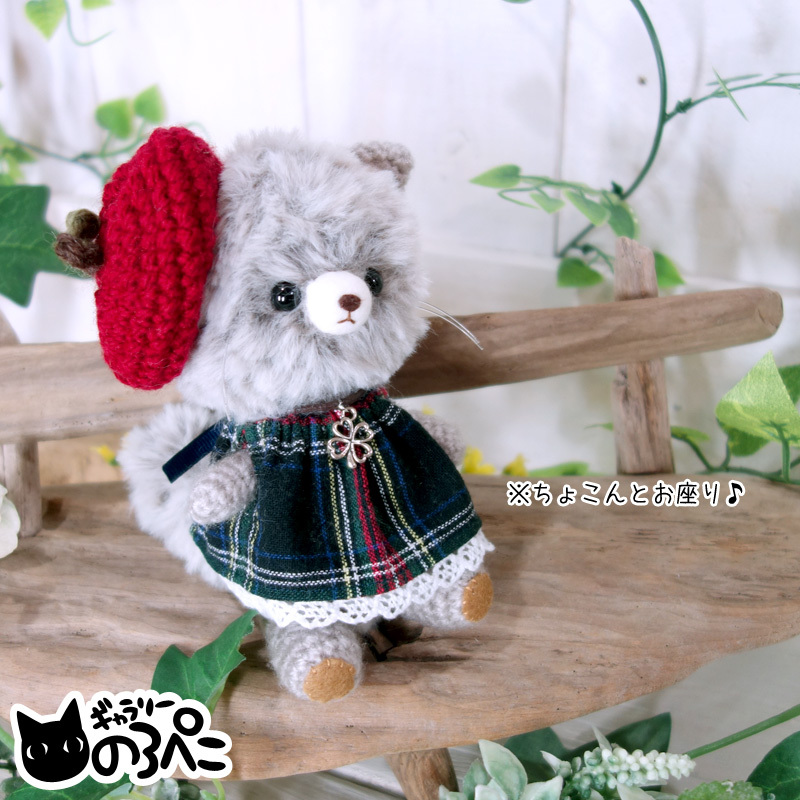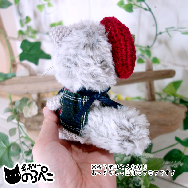 赤いりんごのベレー帽のグレージュ猫ちゃん(タータンチェックワンピースのふわふわ毛糸のあみぐるみ猫ちゃん) bc854-38