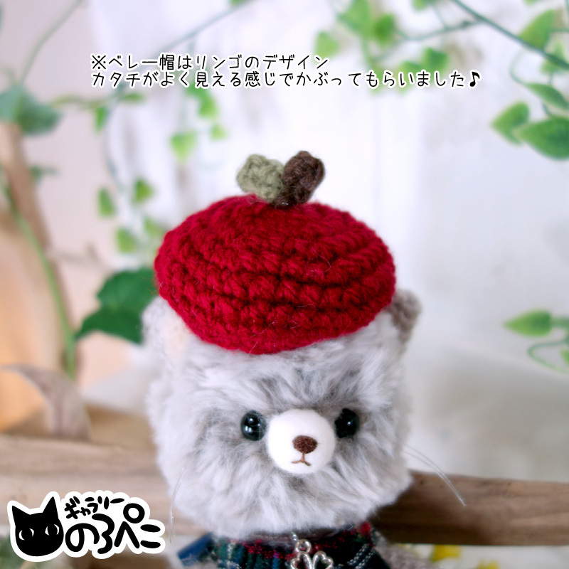 ちょこんとした姿に赤いりんごのベレー帽がよく映えるグレージュのねこちゃんです。