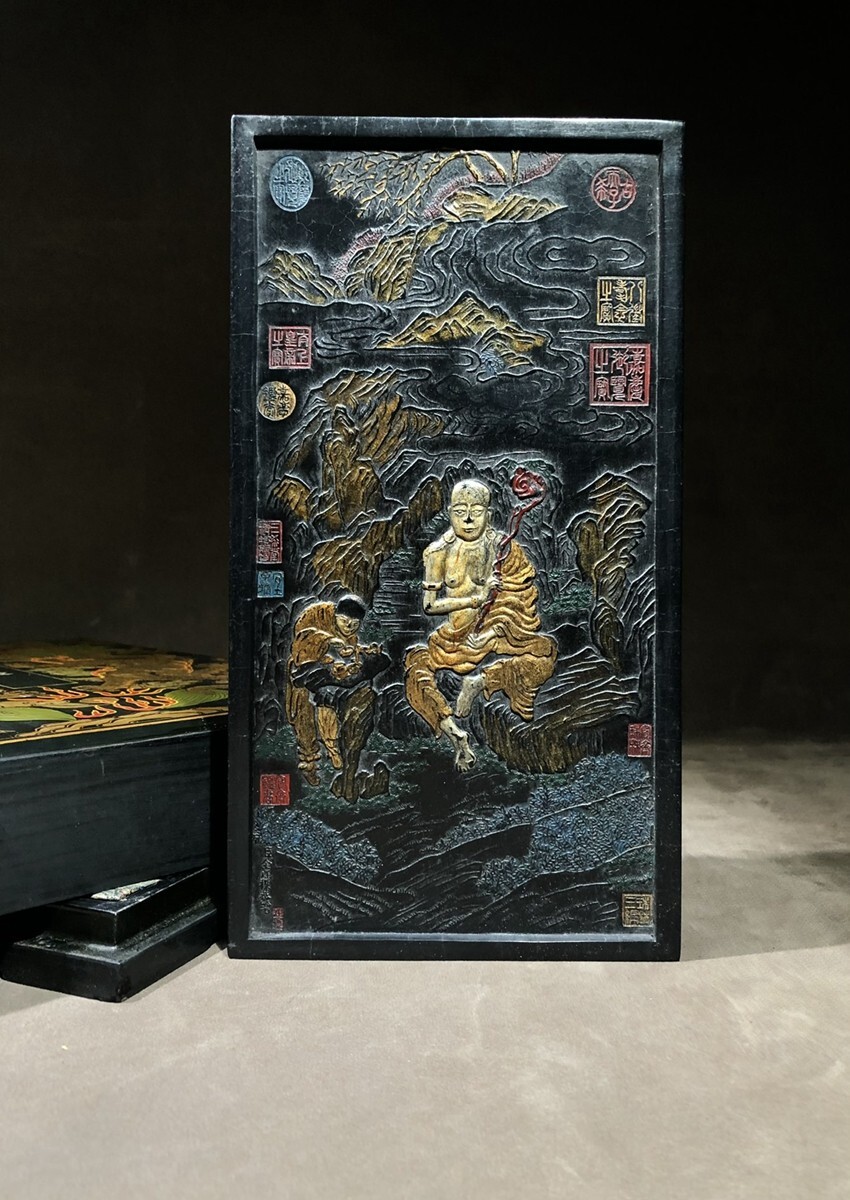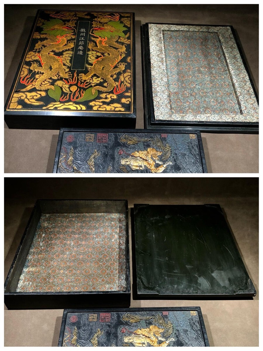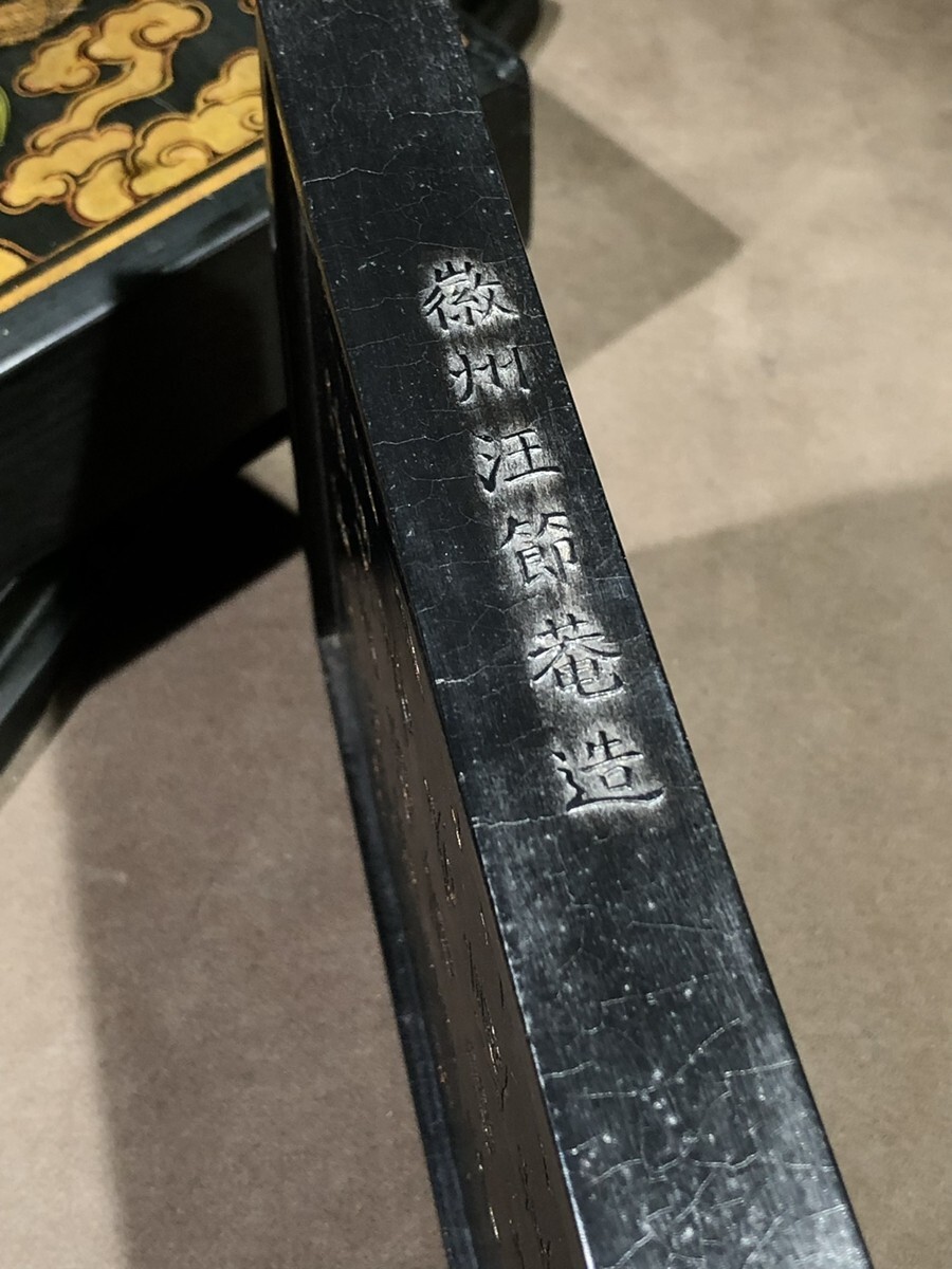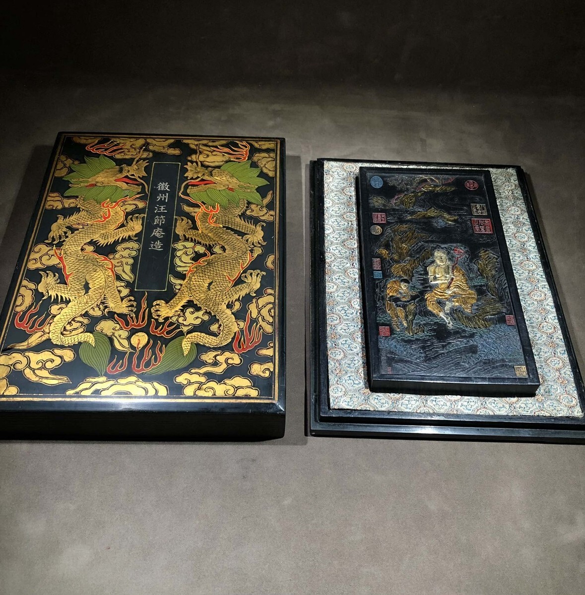 「古墨 施金描彩 靈山羅漢文房油煙墨 嘉慶御覽之寶 徽州汪節菴造銘 清時代」手彫り 文房四宝 書道具 中国古美術 蔵出