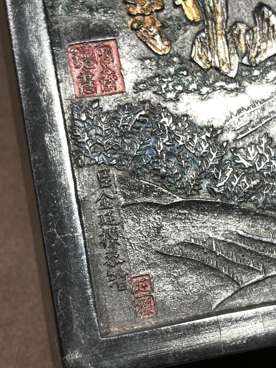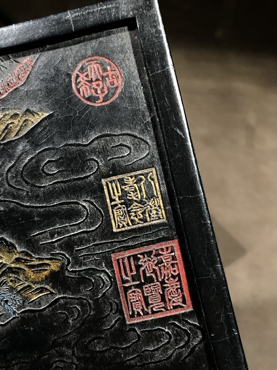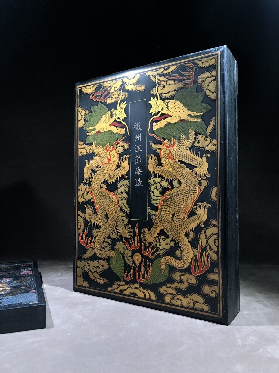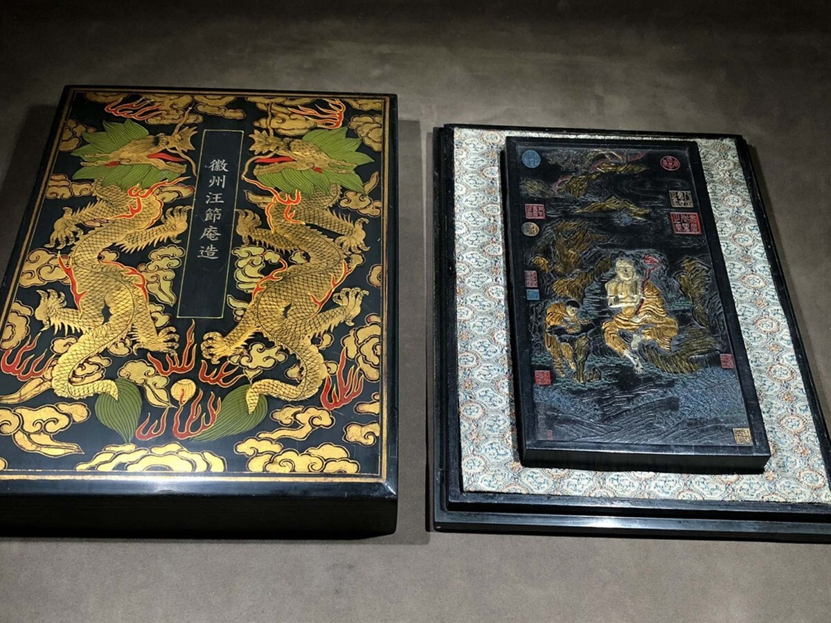 「古墨 施金描彩 靈山羅漢文房油煙墨 嘉慶御覽之寶 徽州汪節菴造銘 清時代」手彫り 文房四宝 書道具 中国古美術 蔵出