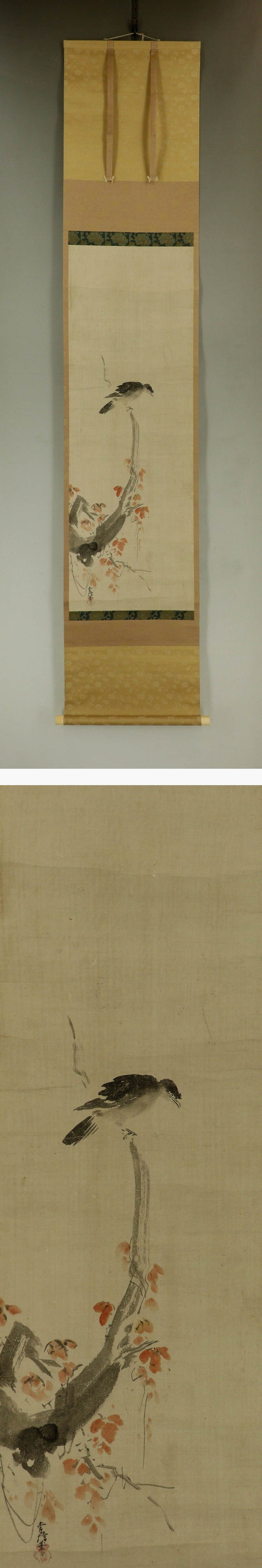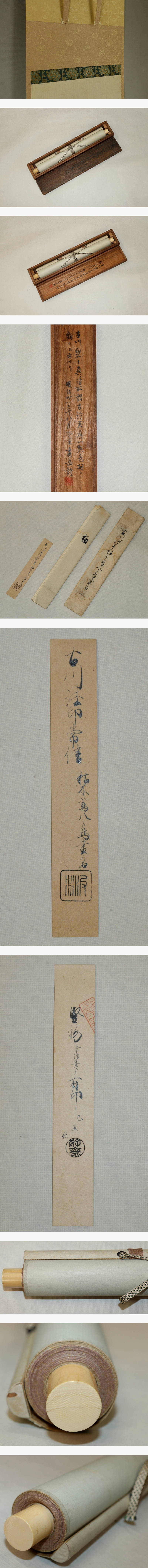 狩野常信 かのう-つねのぶ(1636-1713) 江戸時代前期-中期の画家。 寛永13年3月13日生まれ。狩野尚信の長男。慶安3年(1650)父の跡を継ぐ。 御所障壁画制作に参加し,宝永年間には狩野派の最高指導者として紫宸殿の「賢聖障子」を描く。 宝永6年法印。木挽町狩野家隆盛の基礎を固めた。正徳3年1月27日死去。78歳。 京都出身。通称は右近。号は養朴,古川叟。 本紙は、染み、汚れ、強い折れ、皺、虫食い痕、擦れがあります。 表装は、染み、汚れ、折れ、皺、虫食い、ほつれ、ヤケ、 軸先に軽い汚れと擦れとヒビがあります。 【サイズ】 作品 横約35cm×縦約104cm 表装 横約38.5cm×縦約195cm |