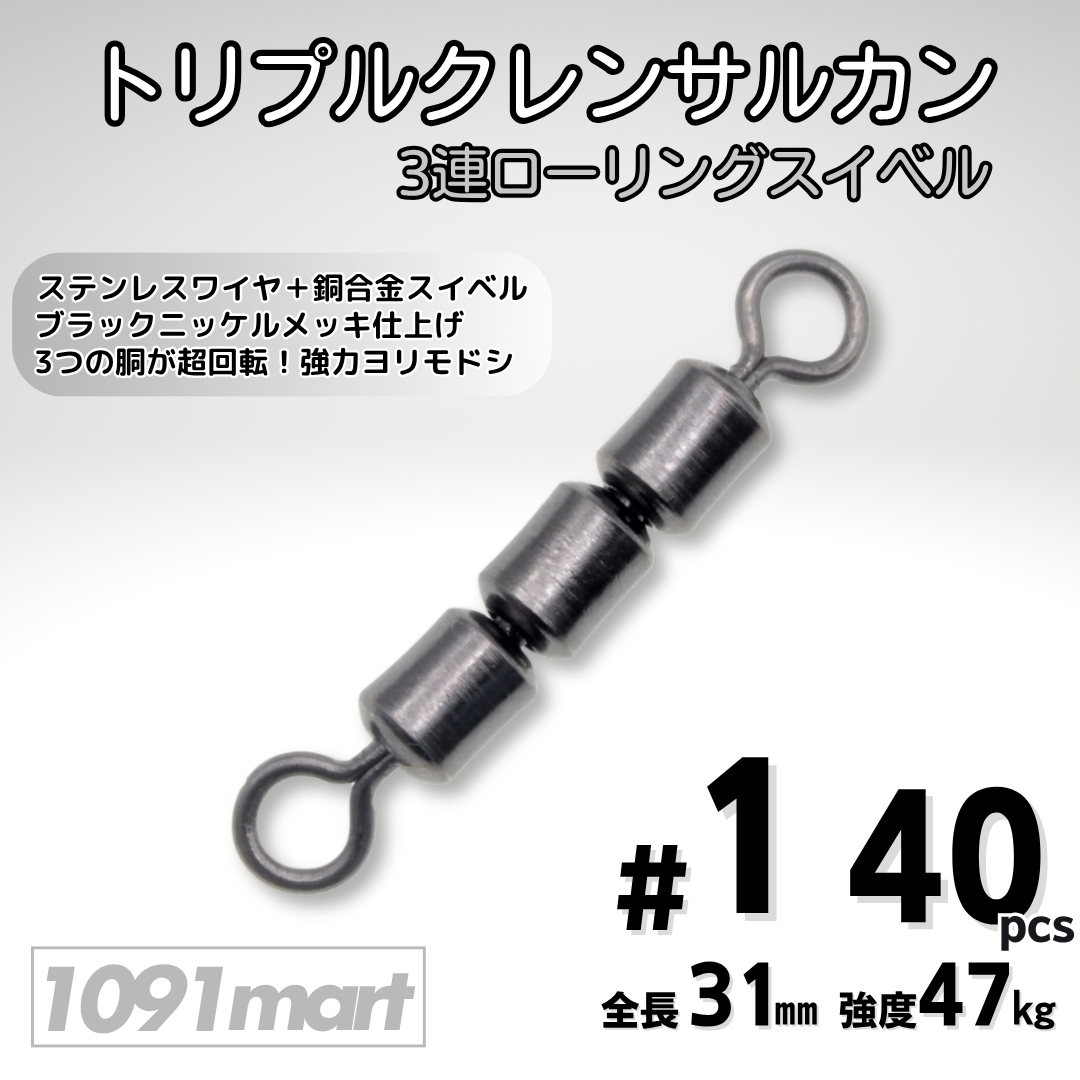 トリプルクレン サルカン 3連 ローリングスイベル #1 全長31㎜ 強度47㎏ 40個セット 強力ヨリモドシ 超回転で糸ヨリ解消!【1091mart】