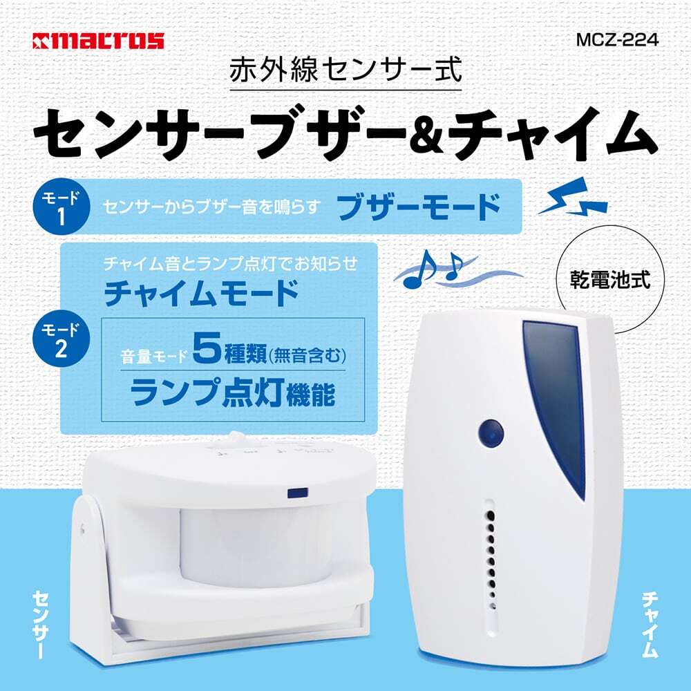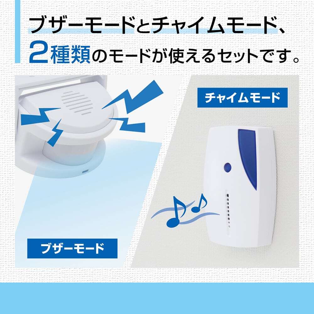 センサーからブザー音を鳴らす「ブザーモード」と、チャイム音とランプの点灯で知らせる「チャイムモード」の2種類の使い方ができるセンサーとチャイムのセットです。