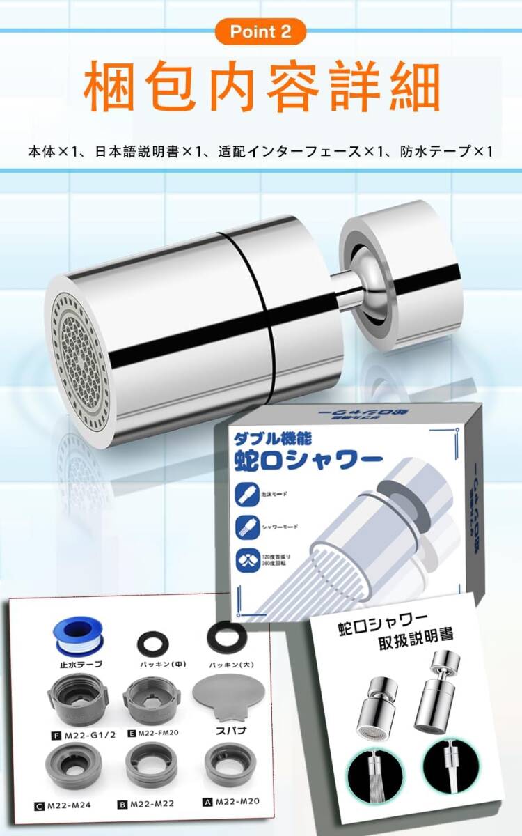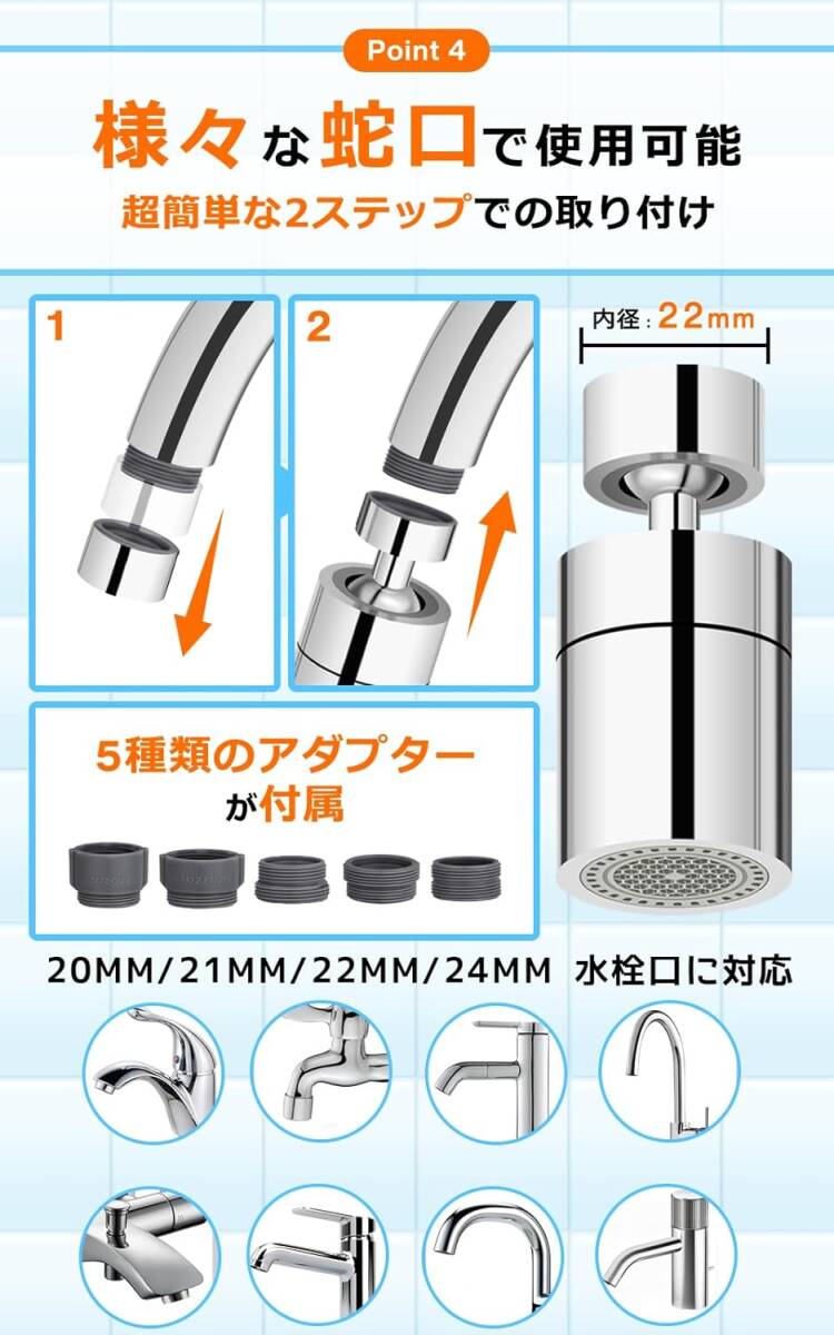 • 【各種の蛇口に適応・日本語説明書付属、1年間の保証付き】 20MM/21MM/22MM/24MMの水栓口に対応しています。キッチンのシャワーヘッドの接続部は、滑り止め設計が施されており、専門家でなくても専門の工具を使わずに簡単に取り付けることができます。また、日本語の取扱説明書を用意しており、取扱説明書に従って簡単に取り付けることができます。各種のアダプターや防水部品を備え、キッチン、トイレ、バスルーム、便器など、さまざまなタイプの水栓に適用されます。また、当社の製品には1年間の保証も付いています。何か問題がある場合は、いつでもお問い合わせください。私たちは洗浄部品のメーカーであり、6年以上の開発と製造の経験を持ち、お客様により良い製品とサービスを提供しています。製品の使用中に問題が発生した場合は、遠慮なくお問い合わせください。迅速かつ誠実に対応しますので、安心してください。パッケージ内容:本体×1、日本語説明書×1、配インターフェース×1、防水テープ×1。