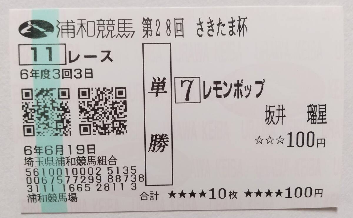 2024年さきたま杯、レモンポップの現地的中単勝馬券(額面100円)です。送料として普通郵便110円のご負担をお願いします。郵送事故等の責任は負いかねます。ノークレーム、ノーリターンでお願いします。