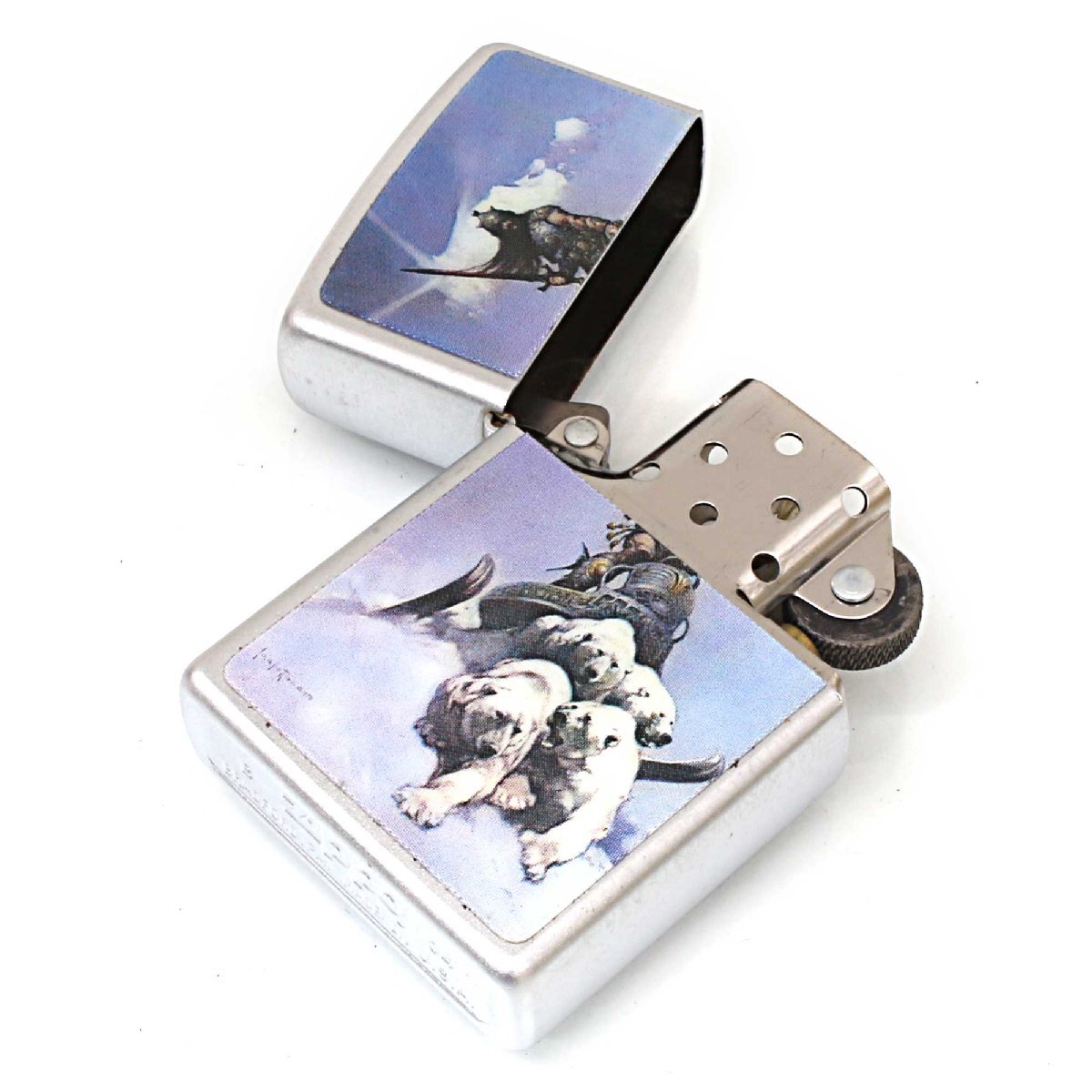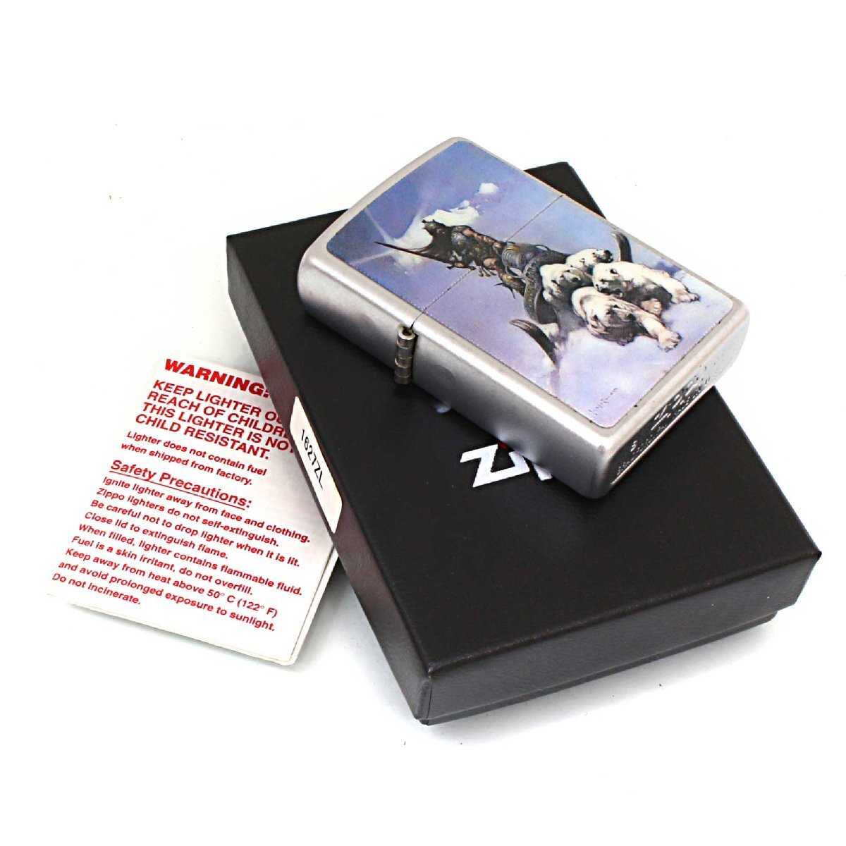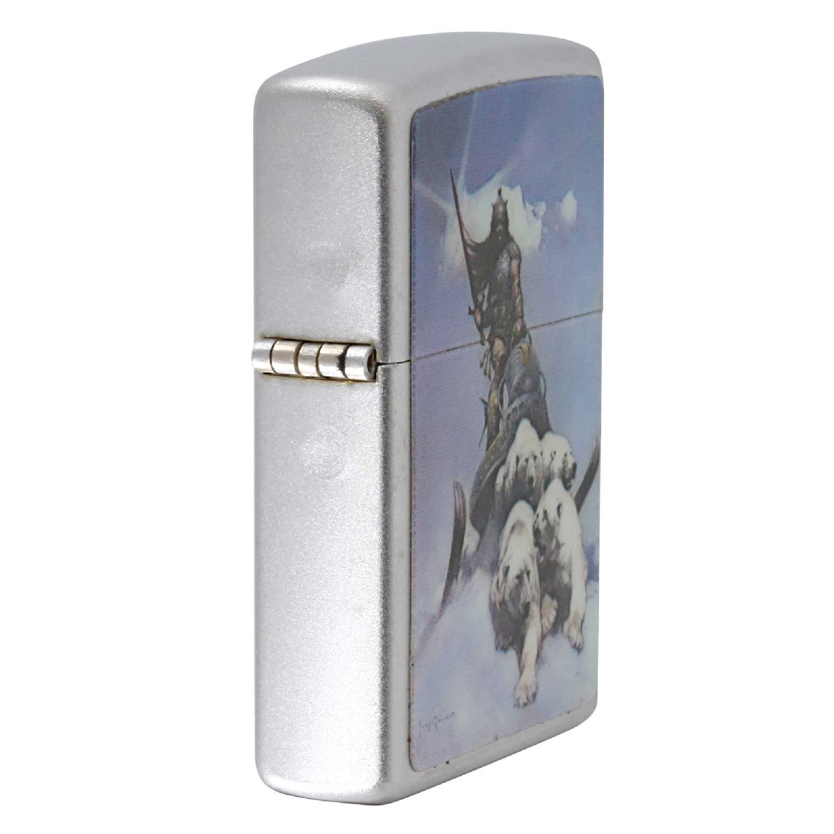 フランク・フラゼッタのデザインプレートが、貼り付けられたZIPPOです。彼は、アメリカ合衆国のイラストレーター。SF、ファンタジー分野の挿絵などで活躍し人気を集めました。No.205サテンクローム、プレート貼り。