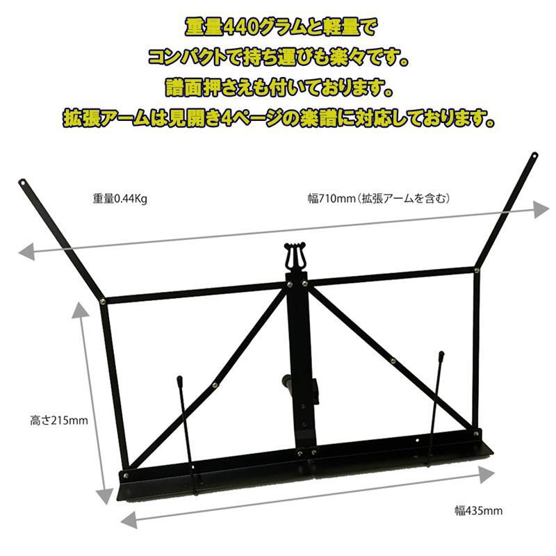 ●譜面台サイズ: 約215(H) x 435(W) [mm] (アーム延長時の幅:約710mm)。
