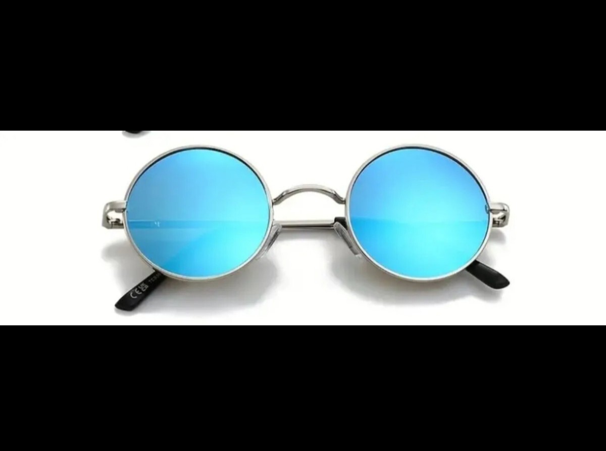 青色のミラーレンズを持つメタルフレームのサングラス。