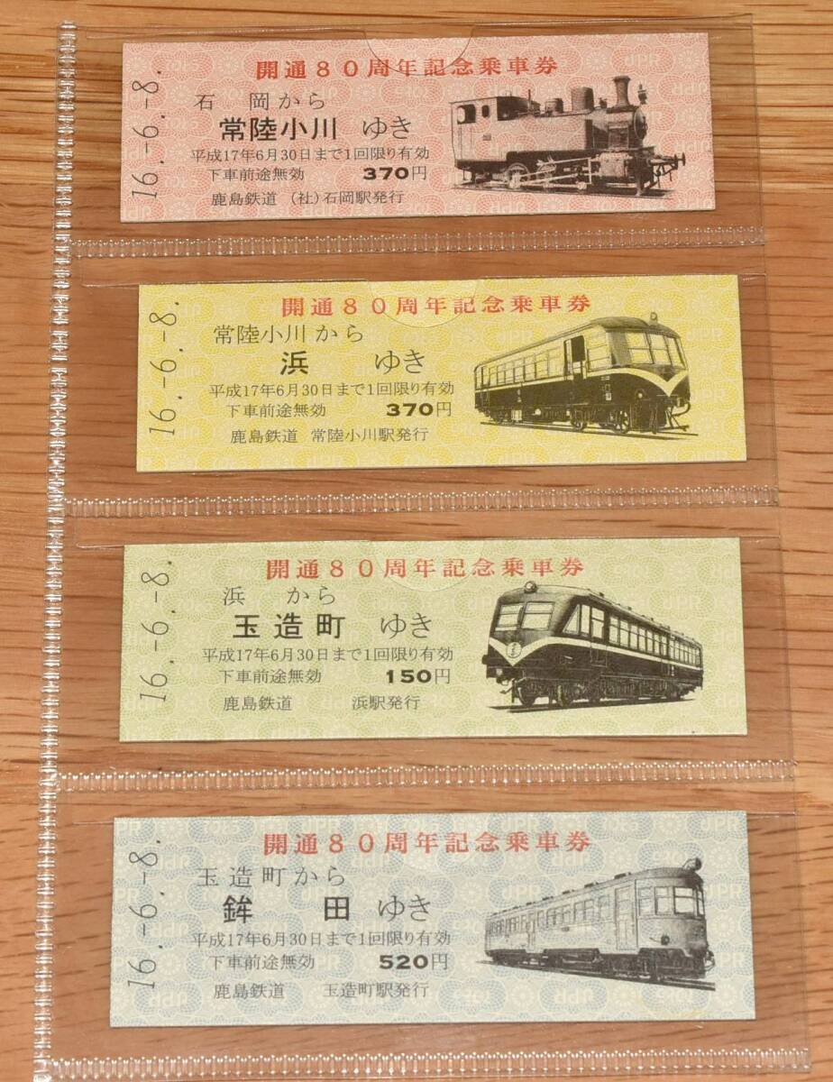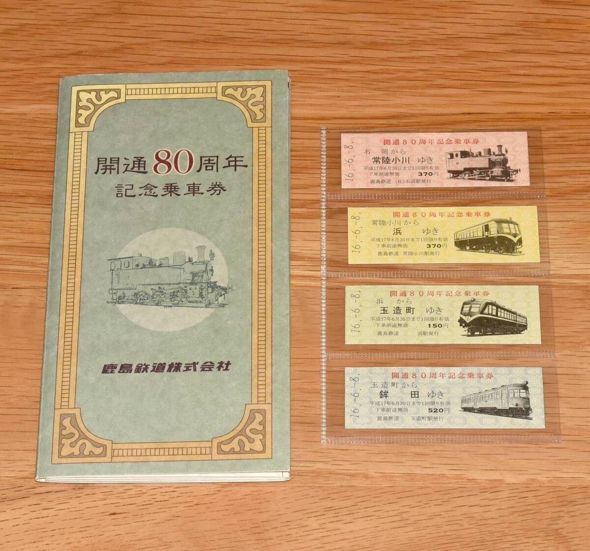 鹿島鉄道 開通80周年記念乗車券 です。古いものなので、経年劣化によるヤケ,シミ,汚れ,折れシワ等見られる場合があります。写真にてご確認下さい。