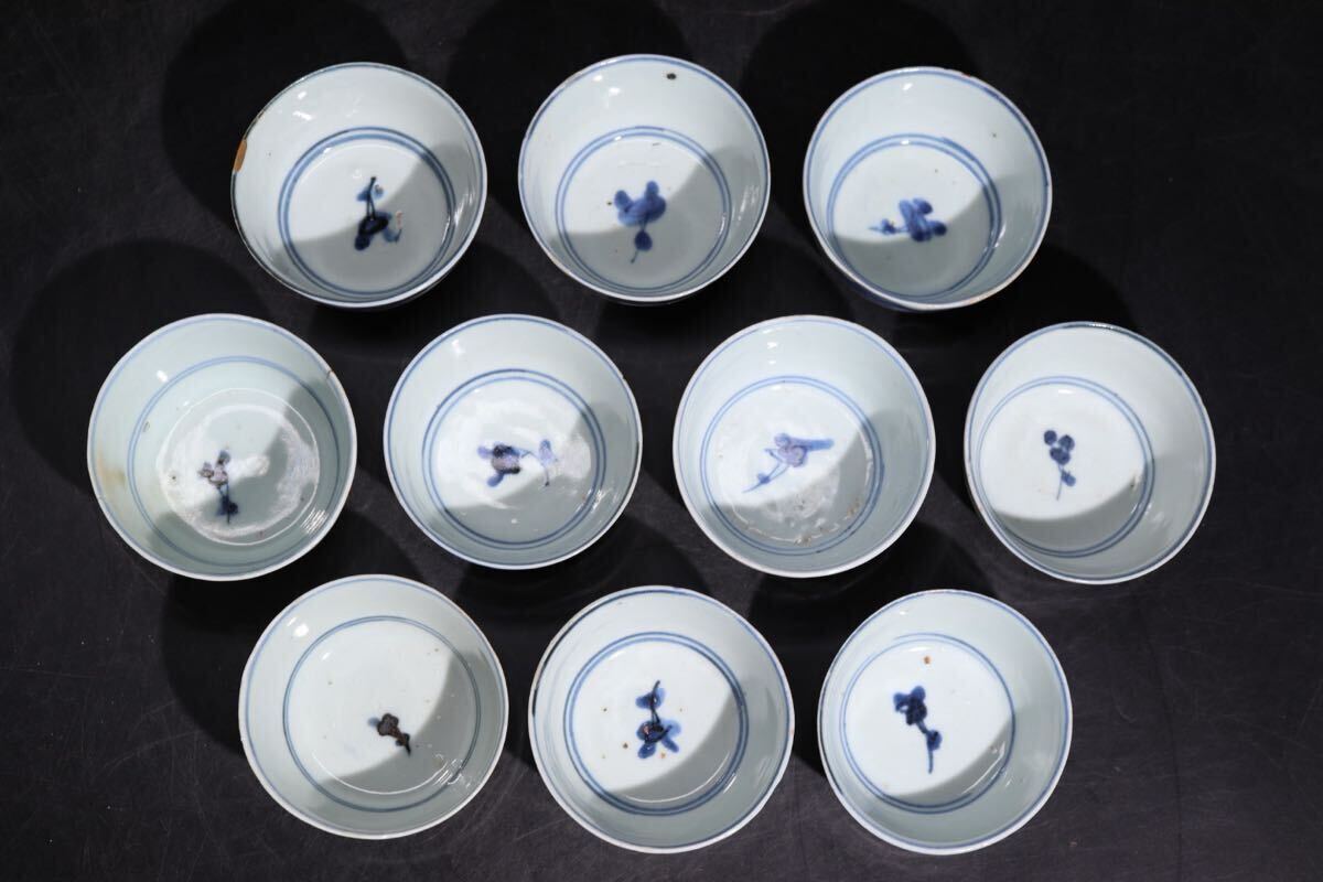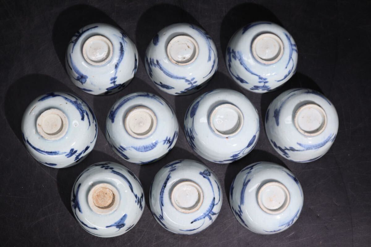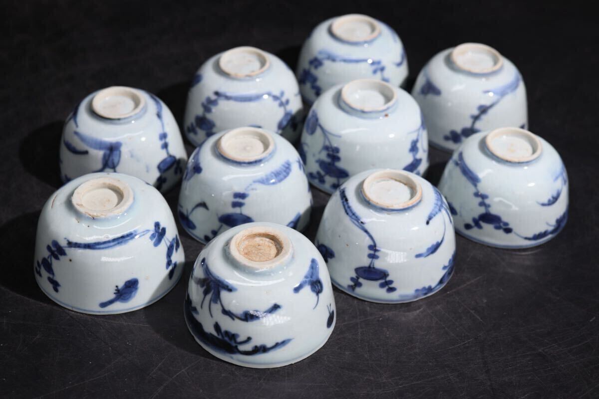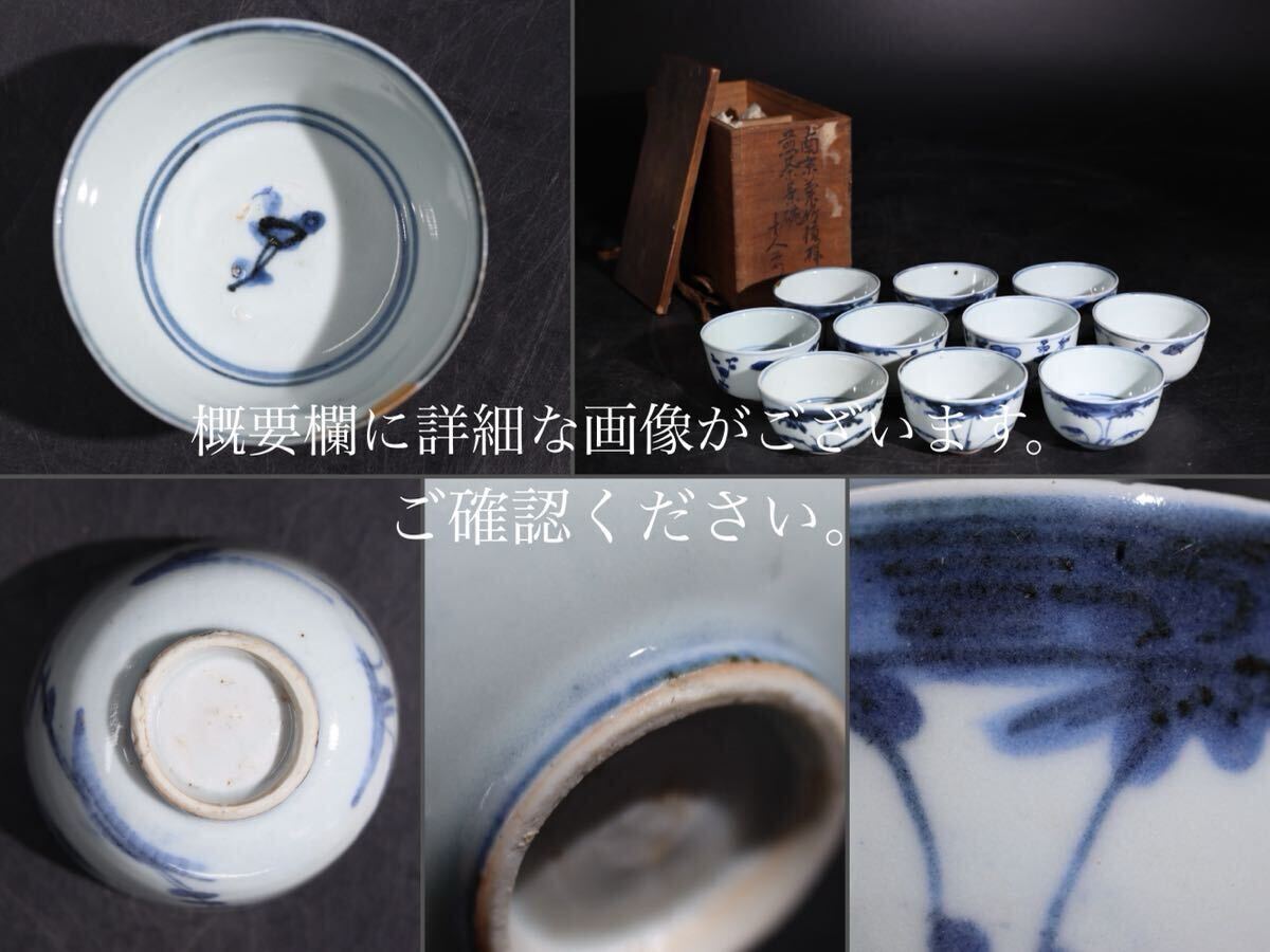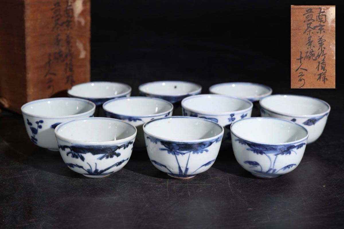 | 「 南京 染付 菊竹模様 煎茶碗 十客 」 金継ぎ 木箱付 / 中国美術 古染付 清代 頃 茶器 煎茶道具 .G1982 |