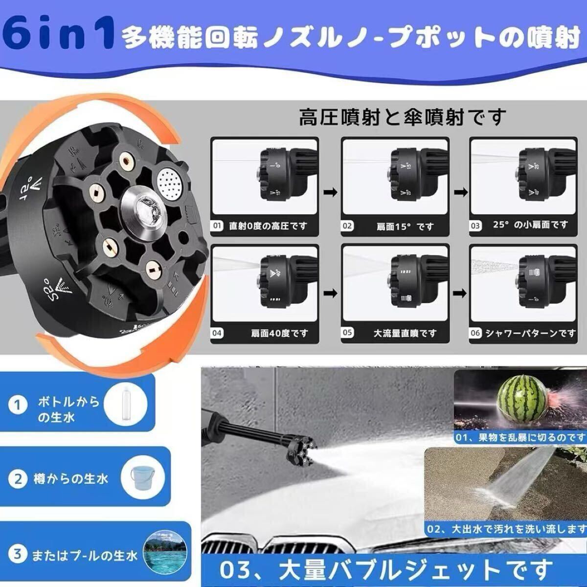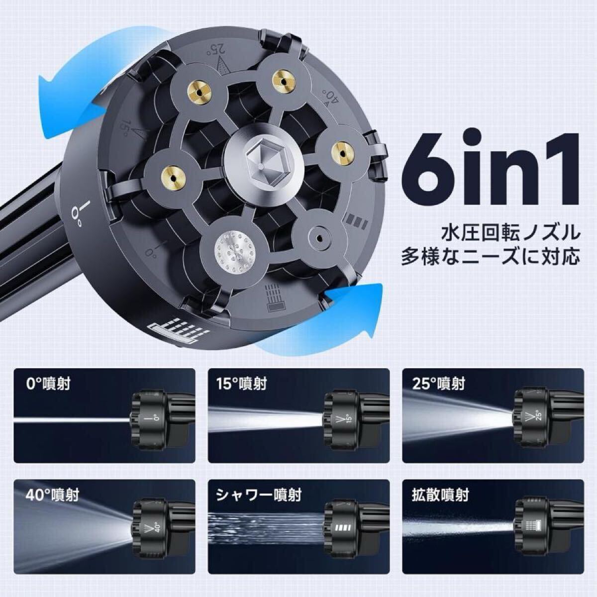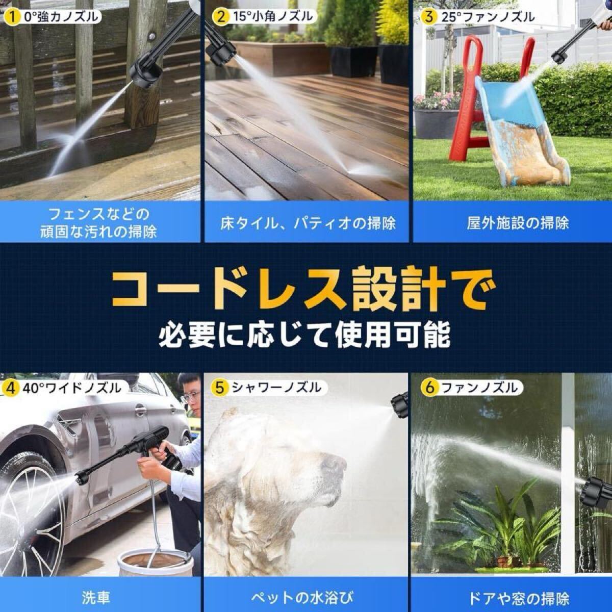 多機能ノズル: この高圧洗浄機には多機能ノズルが装備されており、ノズルを回転させることにより、0°/15°/25°/40°/スプレー/45°傾斜モードなど、さまざまな水モードを簡単に切り替えることができ、さまざまなニーズに対応します。さらに、コードレスパワーウォッシャーにはフォームポットが付属しており、洗剤を追加すると、濃い泡が生成されます。この汎用性により、さまざまな清掃作業に正確に取り組むことができます。