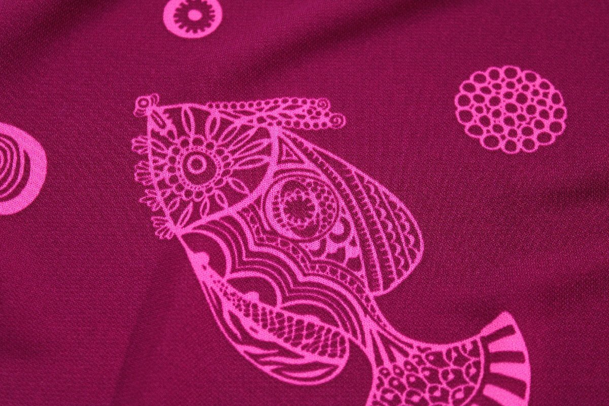 赤紫色のベースに、濃いピンク色でお魚や花柄などのデザインプリントがほどこされています。