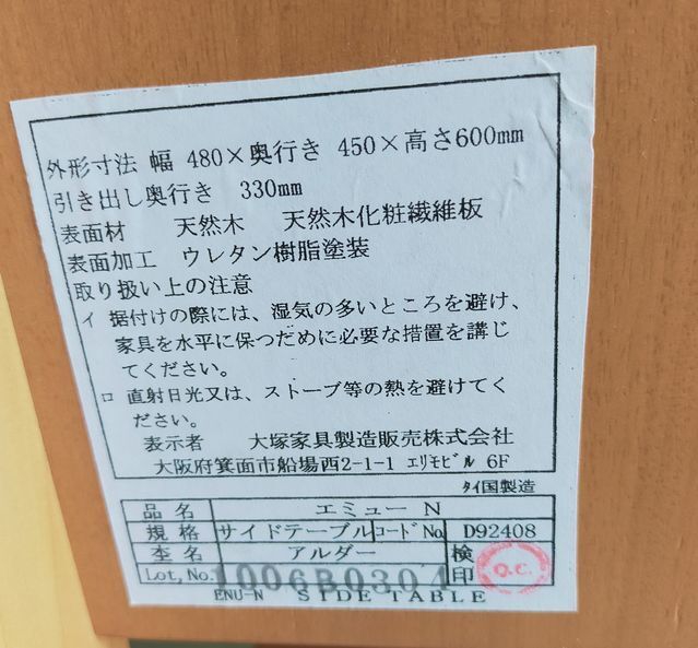 ■主な仕様■ 製造年:不明 メーカー:OTSUKA 大塚家具 モデル:エミューN 実寸サイズ(幅×奥×高)※約:48×45×60cm 下部スペースサイズ(幅×奥×高)※約:34.5×32.5×13.5cm ※当方で計測しました。多少の誤差はご了承ください。 ■セット内容■ 本体、注意書き、固定金具 ※写真に写っているもので全てとなっております。 ■状態■ 現状品となっております。 使用品につきキズ、汚れ等がございますのでご了承下さい。 天板にスレ傷、変色等が見受けられました。 天板右手前角に目立つ傷がございます。 正面から右手前の脚に目立つキズ、色移りがございます。 引き出し上から二段目に変色している部分が見受けられました。 目立ったぐらつき等は見受けられませんでした。 ※その他の状態については写真にてご確認ください。 ■落札のご注意■ 詳しい状態等の質問は当方ではお答えできかねますのでご了承下さい。 現状品の為ご理解のある方以外は入札をお控え下さい。 小傷の見落とし等はご容赦願います。 ノークレーム・ノーリターンでお願い致します。 完品をお探しの方、細部まで気になる方は入札をお控え下さい。 ※ヤフオクのシステム変更により出品者側に電話番号の表示がされなくなりました。 お届け先に表札等がない場合や配達時に不在の場合は再配達に支障がでています。 配達伝票に電話番号を記載をご希望の場合には、予め取引メッセージより連絡先電話番号をお知らせ願います。 ご連絡がない場合や集荷手配前までにご連絡がない場合には配達伝票は電話番号なしになりますので予めご了承願います。 ※配送方法が匿名の場合は必要がございません。※ | |
