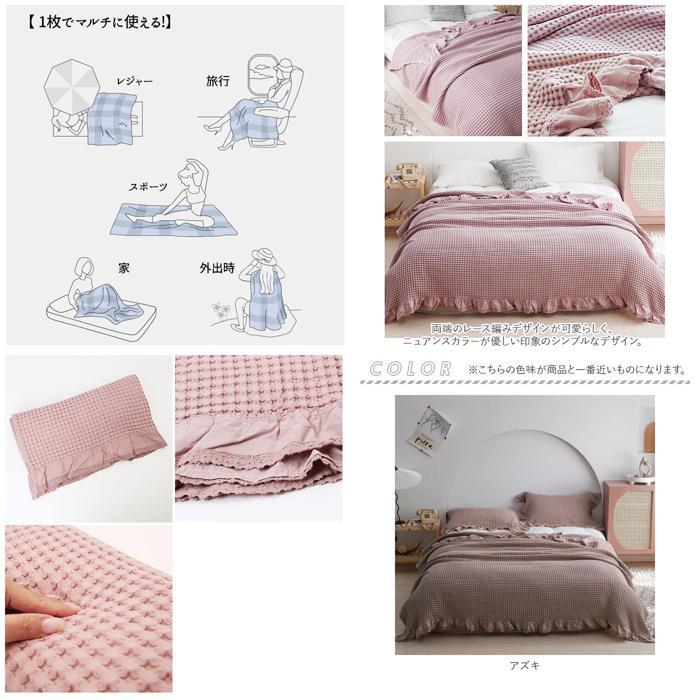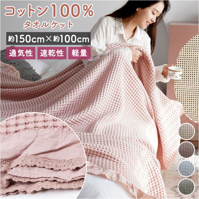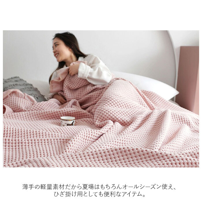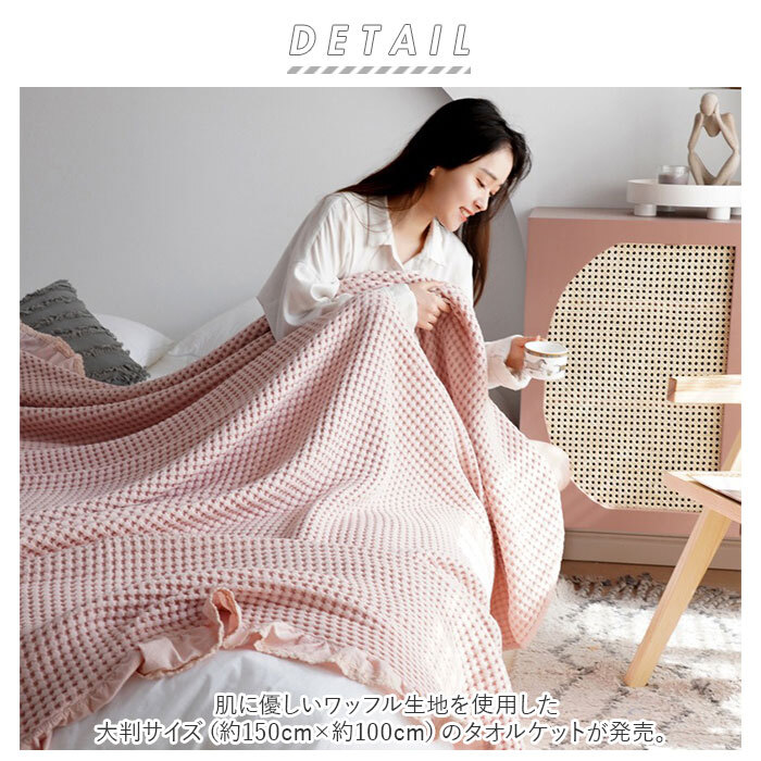 | 商品説明 | ・・肌に優しいワッフル生地を使用した大判サイズ(約150cm×約100cm)のタオルケットが発売。 ・立体的な凹凸感が特徴的なワッフル編みが、ふわふわした柔らかい質感を実現。 ・両端のレース編みデザインが可愛らしく、ニュアンスカラーが優しい印象のシンプルなデザイン。 ・通気性、速乾性に優れた綿100%素材を採用。 ・薄手の軽量素材だから夏場はもちろんオールシーズン使え、ひざ掛け用としても便利なアイテム。 |