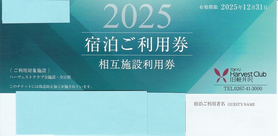| 東急ハーヴェストクラブ、旧軽井沢の宿泊ご利用券、相互施設利用券です。 本券1枚につき、1泊1室を会員料金で利用出来ます。 有効期限は2025年12月31日までとなっております。 詳細は公式HPをご覧ください。 https://www.harvestclub.com/Un/fact/ | ||