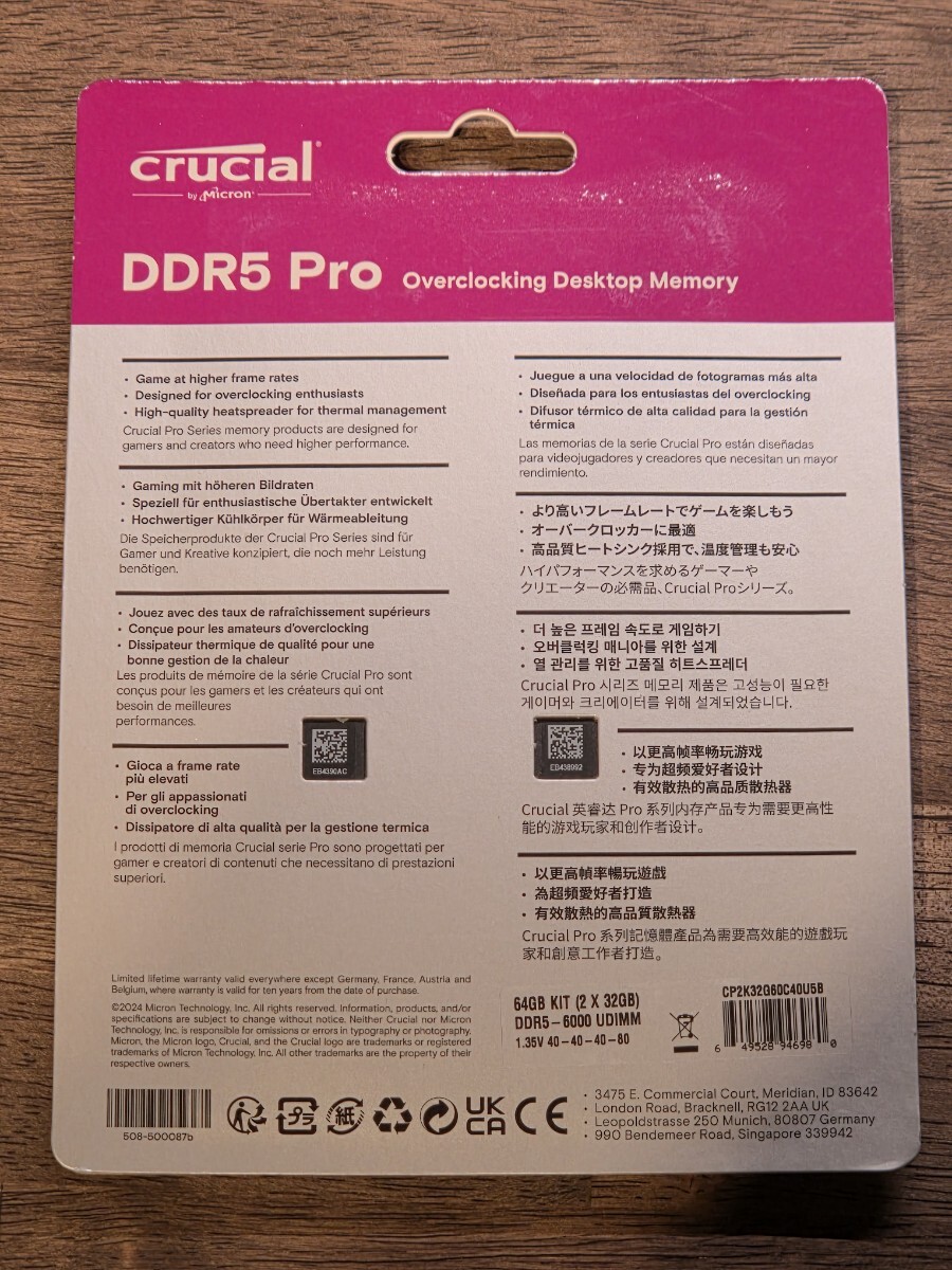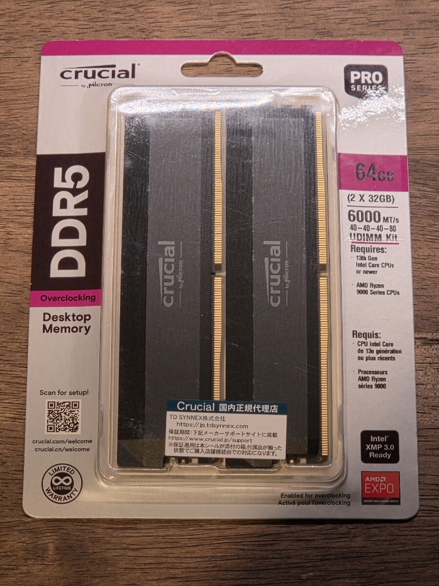 【新品未開封】【DDR5 PC5-48000 32GB 2枚組】 Crucial Pro DDR5-6000 64GB Kit (32GBx2) UDIMM OC Gaming Memory Black [CP2K32G60C40U5B]