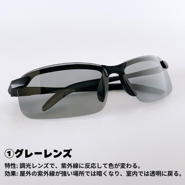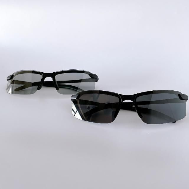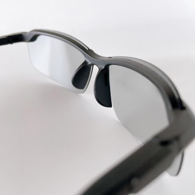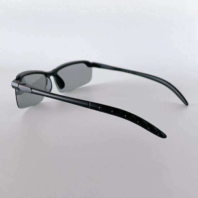 偏光レンズが反射光をカットし、調光レンズは紫外線に応じて色が変化。昼夜を通じてクリアな視界を確保。