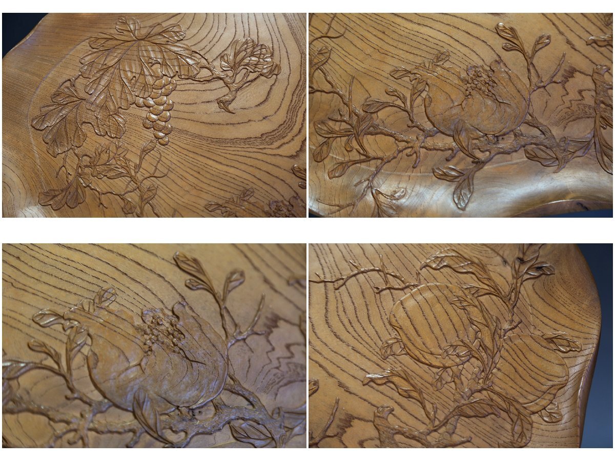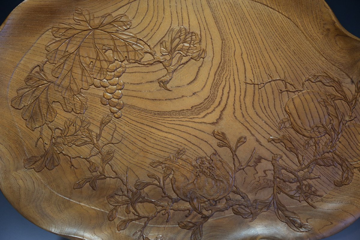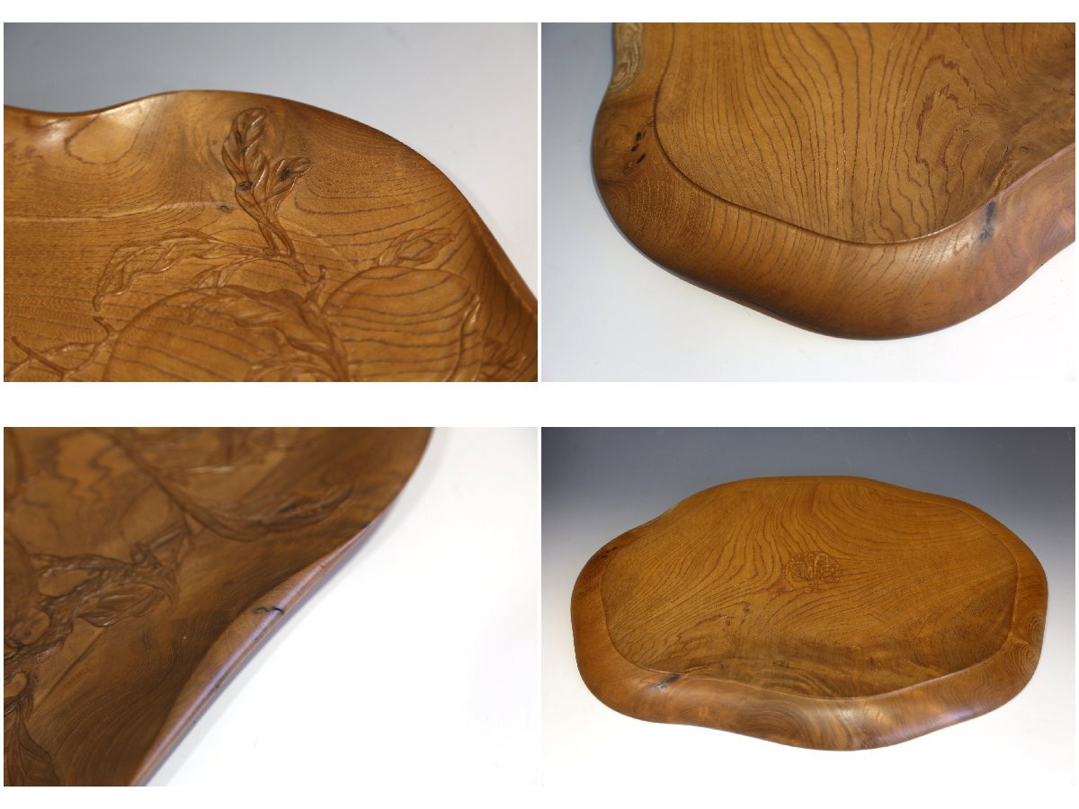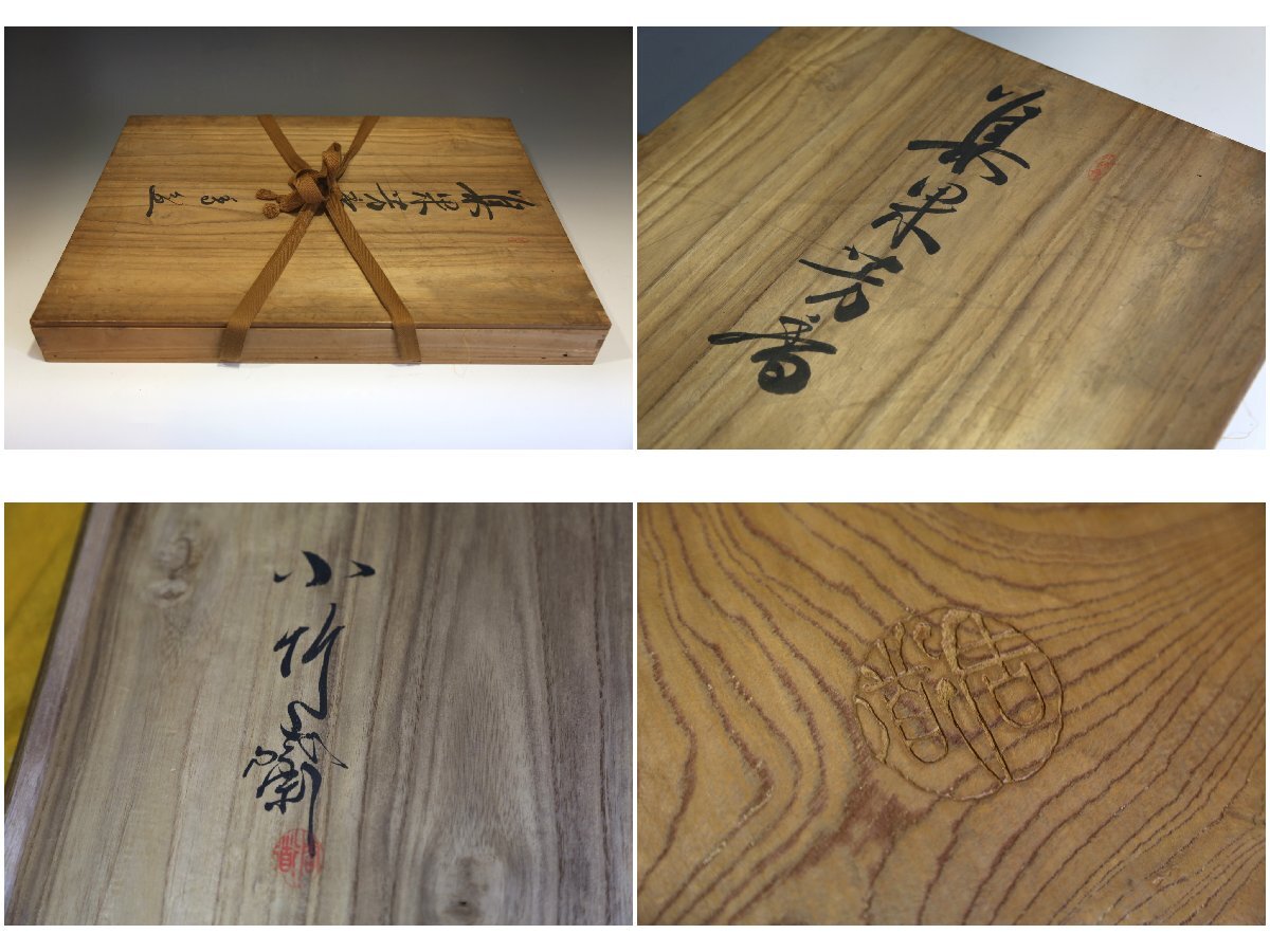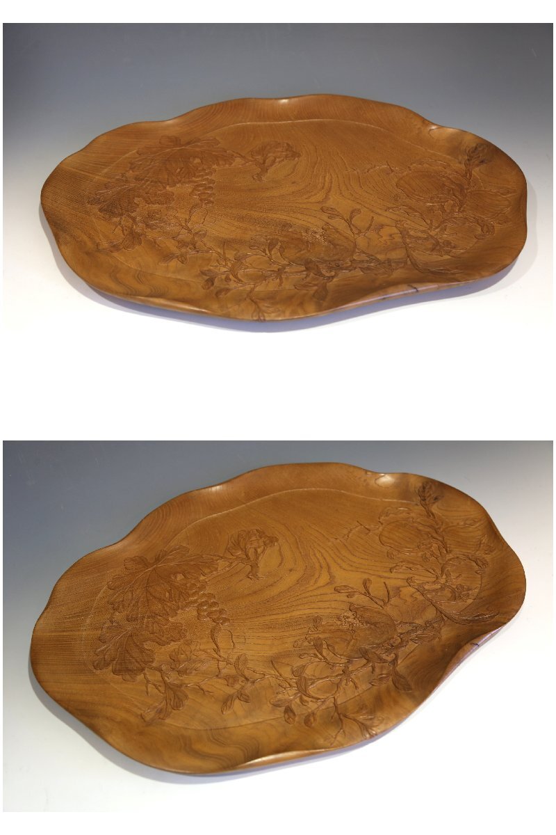 「小竹斎.市川周道」(1872~1936): 卓越した技術で風雅な煎茶趣味の盆類などを多く残し、姫路の木工芸に独自の特色をもたらした小竹斎(しょうちくさい)こと市川周道(明治元年~昭和11年)。播磨の刳物師として名高く、播磨木工芸の中心的な存在であった。 写真のような部分がありますが、綺麗で状態良好です。皿立ては付きません。縦39cm、横54.5cm。ノークレーム、ノーリターンでお願い致します。この他にも出品しておりますのでご覧下さい。ここをクリック