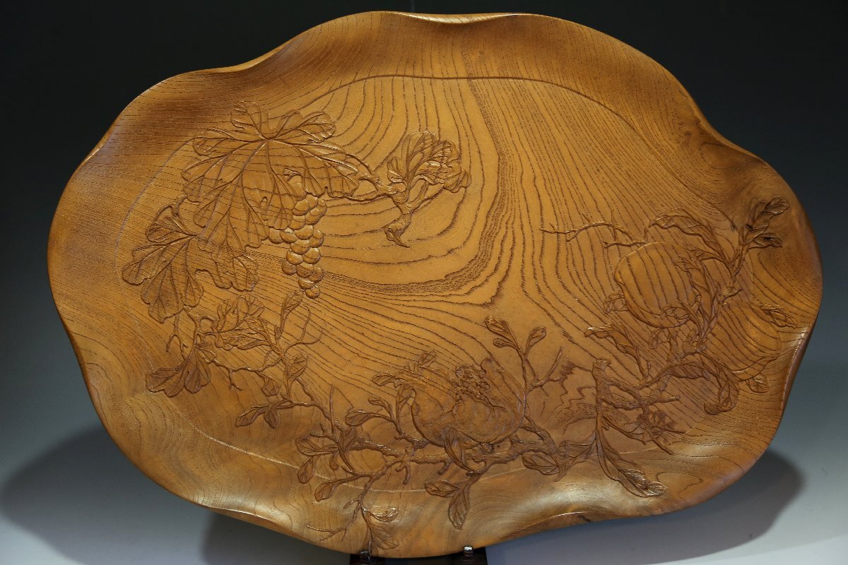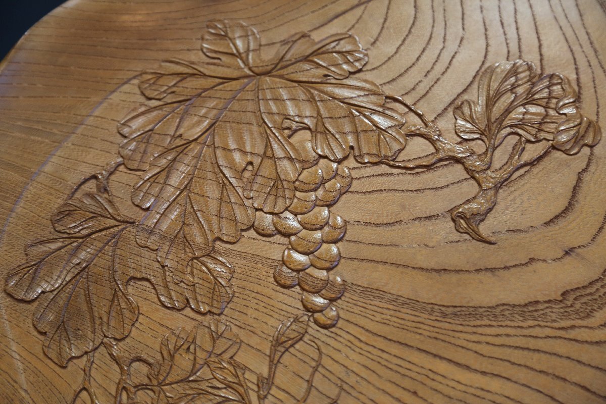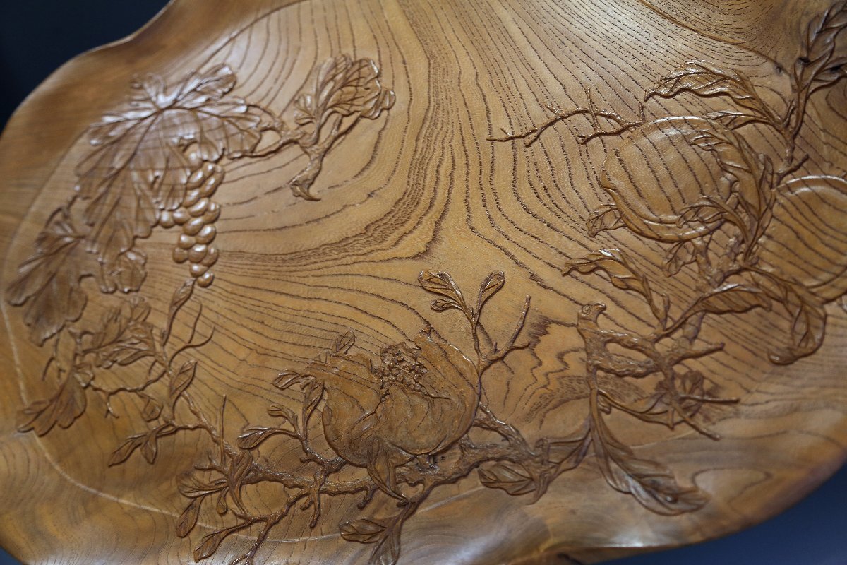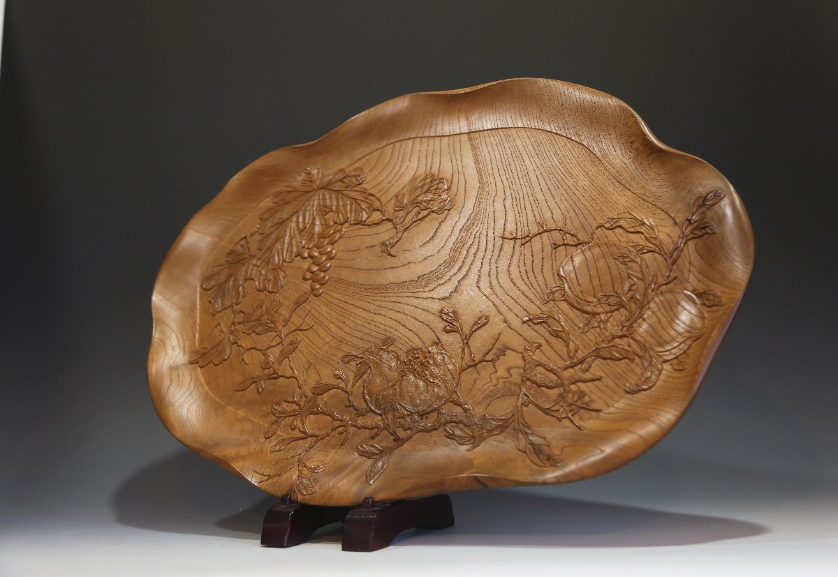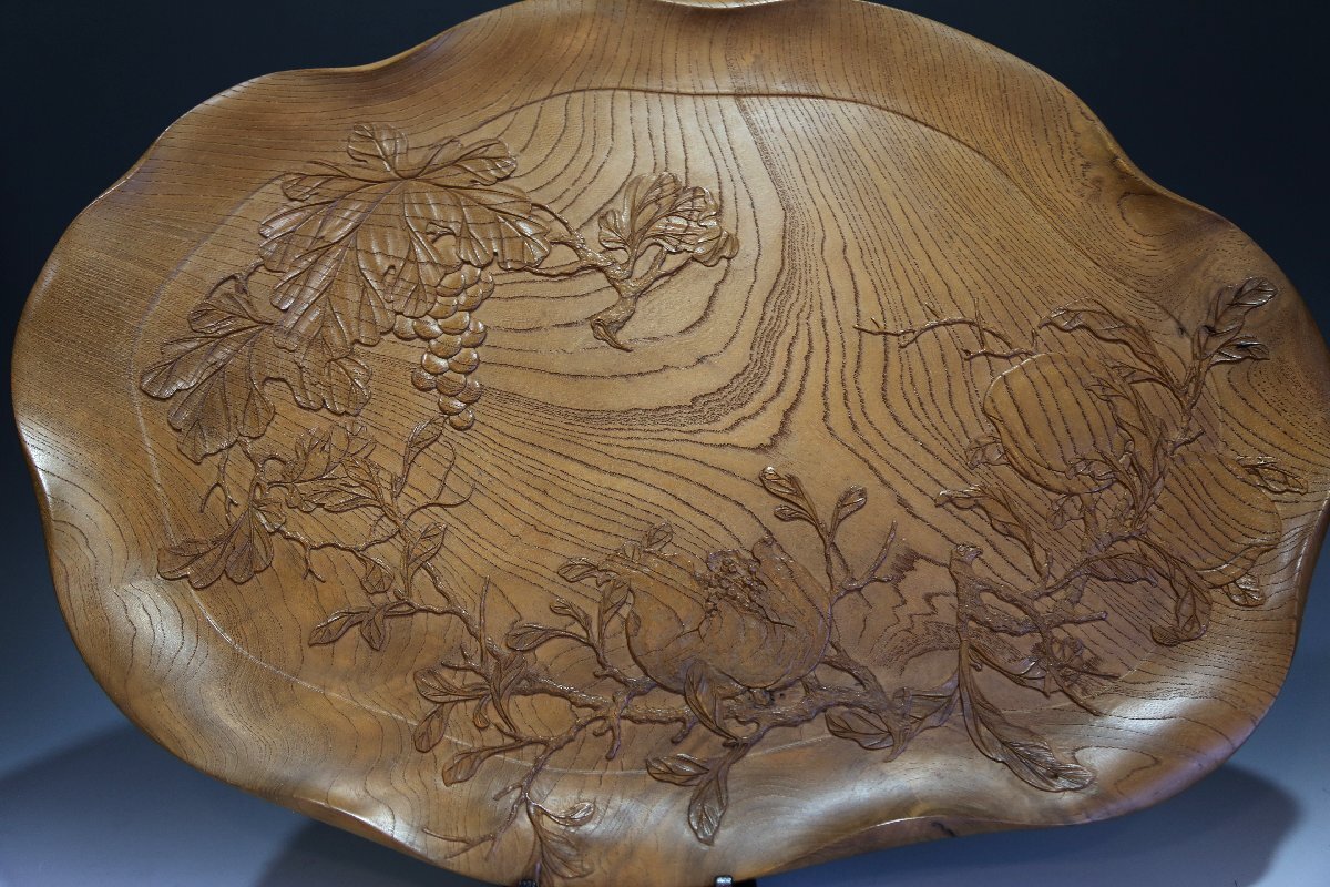 「小竹斎.市川周道」(1872~1936): 卓越した技術で風雅な煎茶趣味の盆類などを多く残し、姫路の木工芸に独自の特色をもたらした小竹斎(しょうちくさい)こと市川周道(明治元年~昭和11年)。播磨の刳物師として名高く、播磨木工芸の中心的な存在であった。 写真のような部分がありますが、綺麗で状態良好です。皿立ては付きません。縦39cm、横54.5cm。ノークレーム、ノーリターンでお願い致します。この他にも出品しておりますのでご覧下さい。ここをクリック