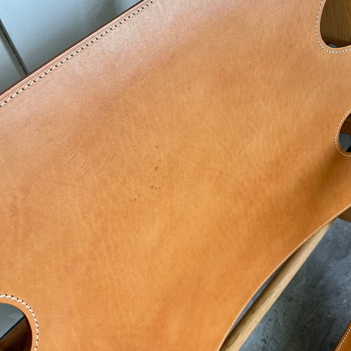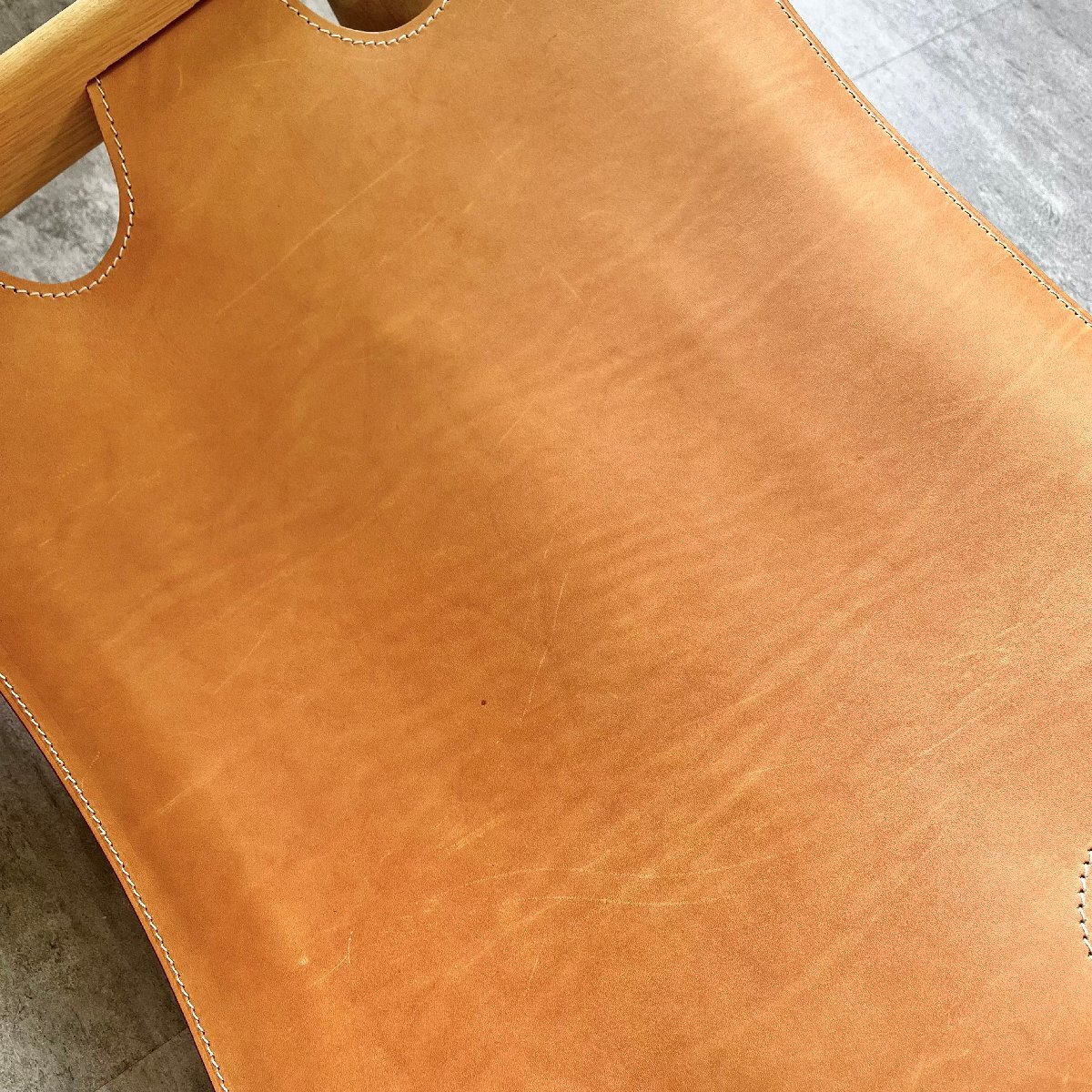 座面・背もたれは厚手のサドルレザー一枚革で、座部分はキャンバス裏張りになっているため、伸びにくく耐久性に優れています。経年で柔らかくなり、また天然革ナチュラル色は、使い込むほど味が出るのが魅力。 ヴィンテージジーンズのように、自分だけの「特別な椅子」として育てたいチェアです。
