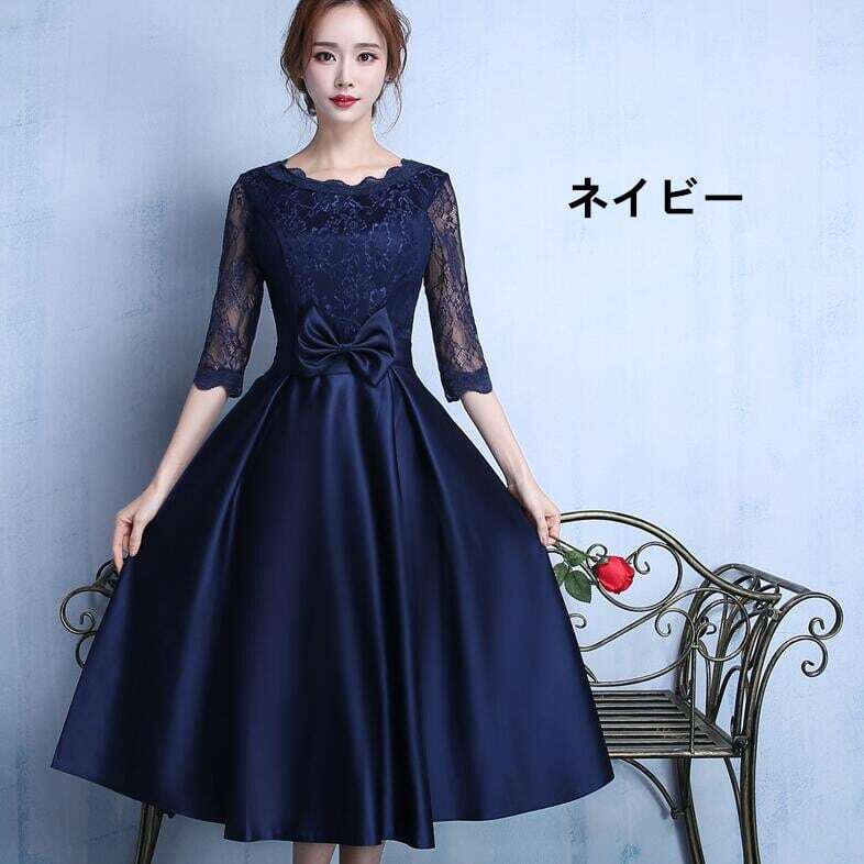 エレガントパ-ティ-ドレスです。ウエストの大きなリボンがとても可愛い気品に満ちたとてもエレガントで上品なひとクラス上をいく一品です。トップス部分のレースの透け感もとても上品でエレガントです。裏地有。背中ファスナ-有。胸パット付。