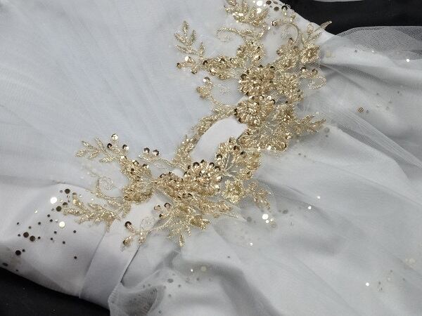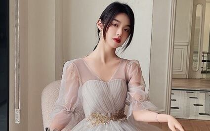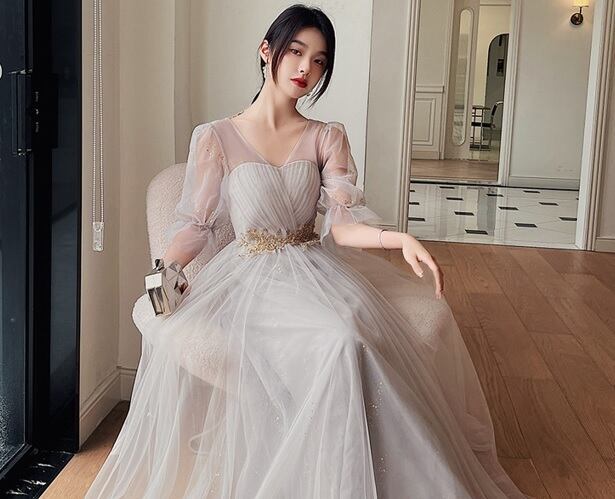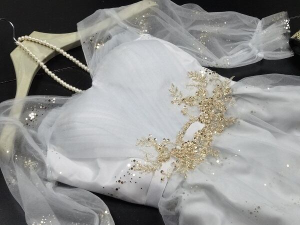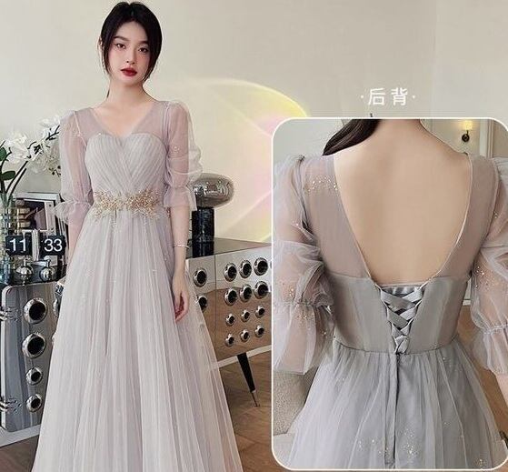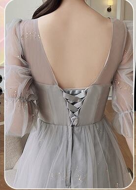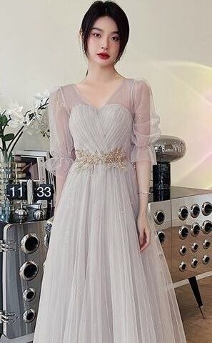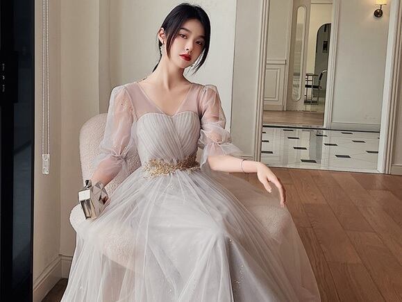 チュール膝丈パーティードレス。グレ-のサテン地の上に、同色のチュールを重ねたデザインで優しい印象のドレス。腰部分はゴールド色のボタニカル柄を刺繍。袖はチュールのみで肌をほんのり見せ、袖先をゴムをしぼることで可愛らしさがアップ。パーティやイベント、結婚式など、様々なシーンで、気品のある印象を与えてくれる一枚です。背中網掛け。腰下ファスナ-有。裏地あり。胸パット付き。