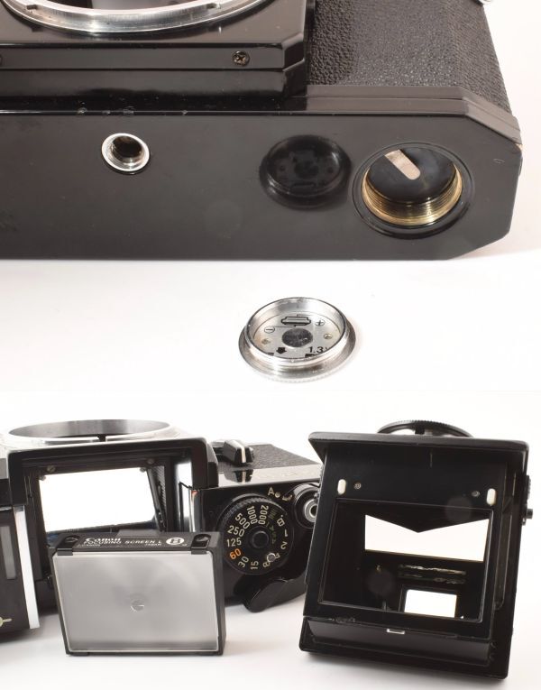 光学系:アイレベル、フォーカッシングスクリーン内は清掃済みですが、プリズムに取りきれない点ゴミがあります。(腐食ではありません)又、スクリーンフレネル部に経年劣化による点汚れが見えます。