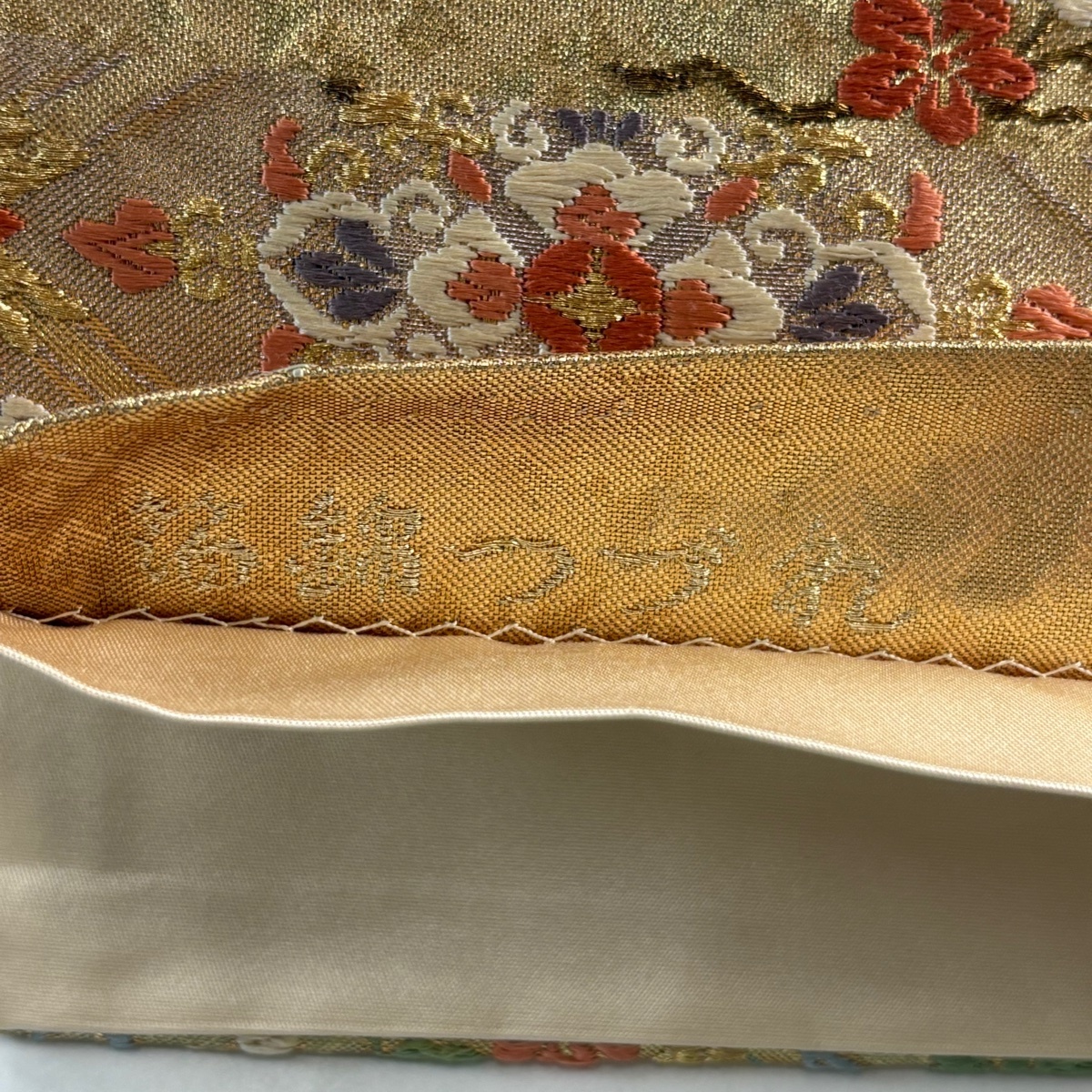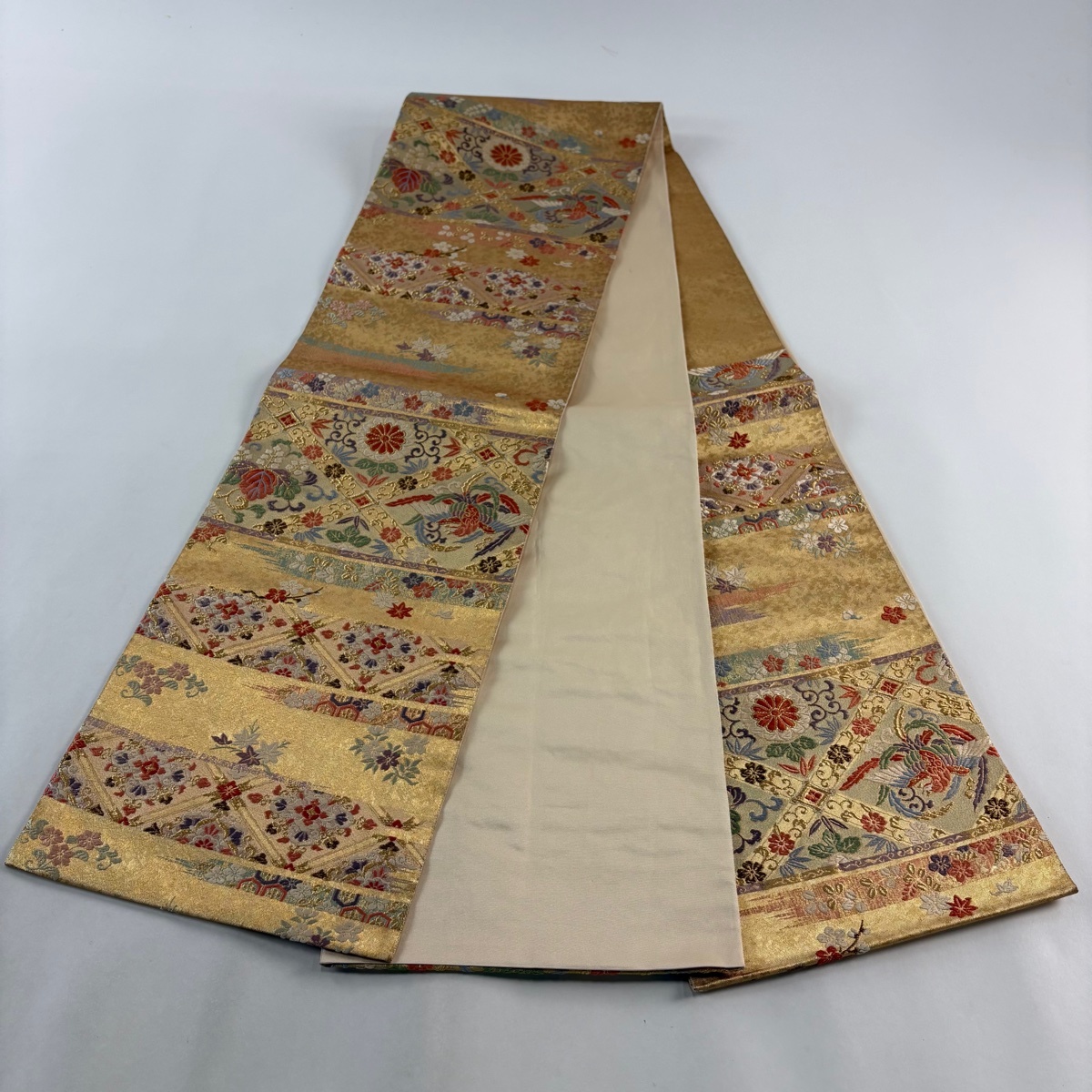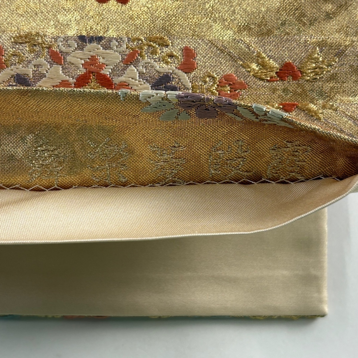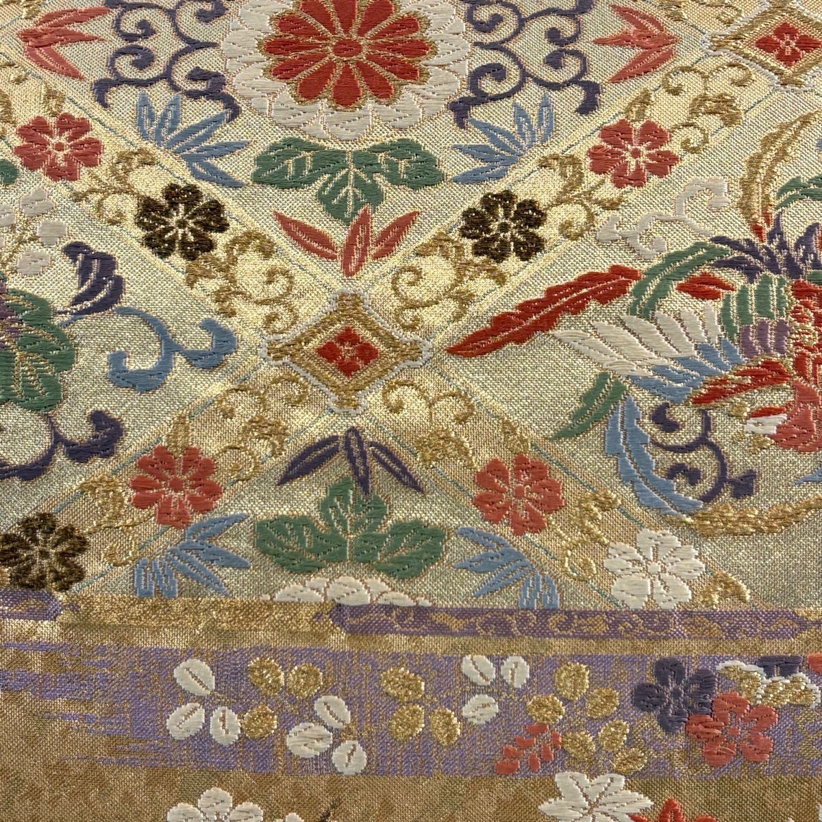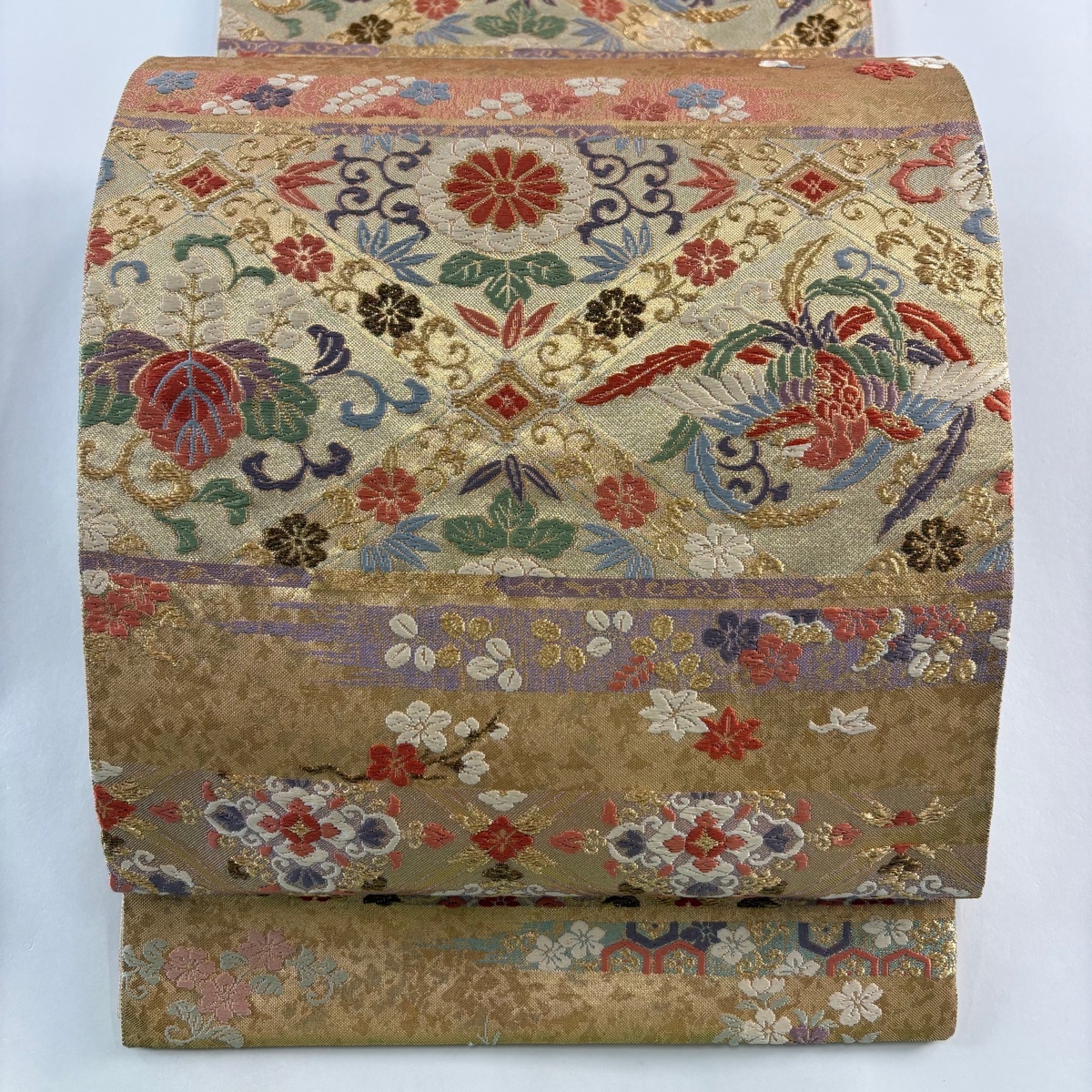 | 袋帯 美品 秀品 舞楽菱段霞 箔錦つづれ 鳳凰 花唐草 金糸 箔 金色 六通 正絹 【中古】 |