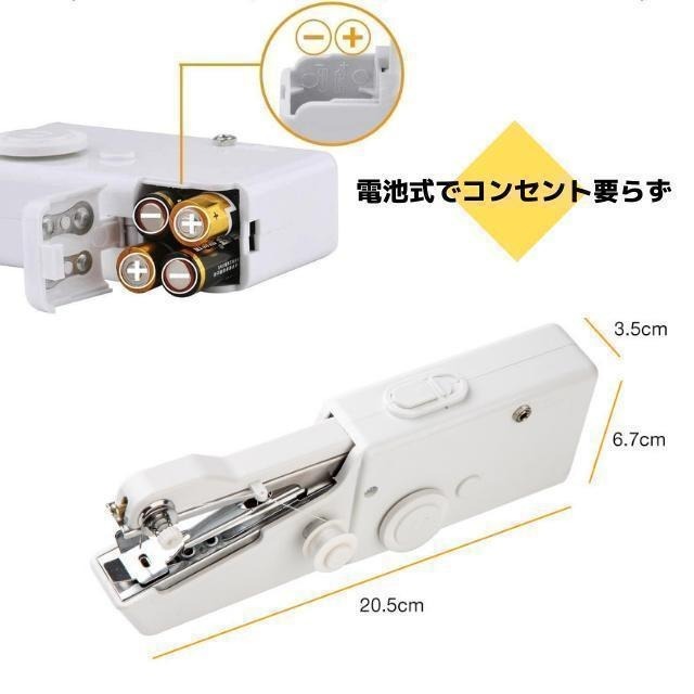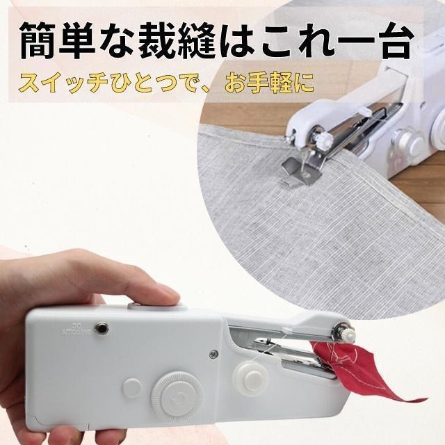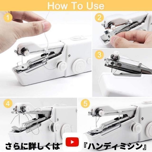 布を挟んで、片手で電源スイッチを ON/OFFするだけ!プーリーを右から左に回して針を一番上の位置に上げます。上糸だけで縫うチェーンステッチタイプ。もし失敗しても簡単に糸を外せる!スーツ・スラックス・スカート・制服の裾揚げに!ハンディミシンは入園・入学準備にバッグを作ったりするのにも便利です!(ご注意:縫えない、空回りの場合は下記「商品の説明」にての対策方法を参考して、針の調子をご確認してください。