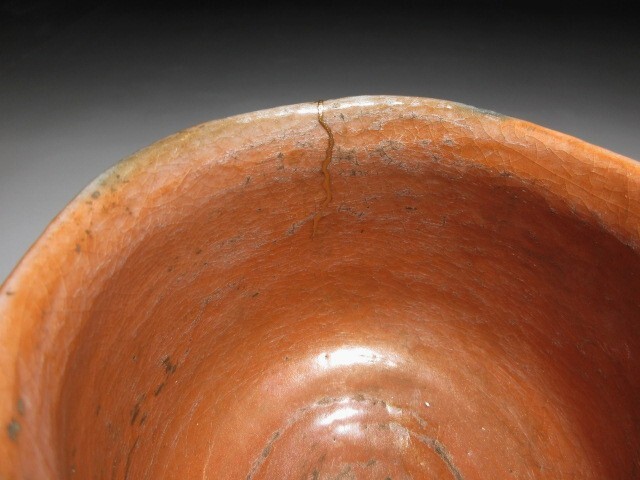 楽吉左衛門六代 左入の赤 茶碗です。 古い桐箱(極め箱です)に入っています。 箱蓋に、裏千家八世 又玄斎 一燈の書き付けがあり、 銘【錦心】とあり、又玄斎の花押があります。 滑らかな質感で、手に馴染む柔らかなくびれの施された お手取り良いお茶碗です。 高台中に、左入の印があります。 時代の大変貴重な逸品です。 ☆サイズ☆ 幅約11.1cm 高さ約10.1cm ☆状態☆ とても古い時代の為、縁に一箇所、金継ぎが見られます。 他、目立つ割れ・欠け等はありませんが、 時代経過の為のスレ・使用感など、お写真を良くご覧頂き ご納得の上ご入札をお願い申し上げます。 ※撮影に使用しております皿立て等、特記がない限り付属ではありません。 |
