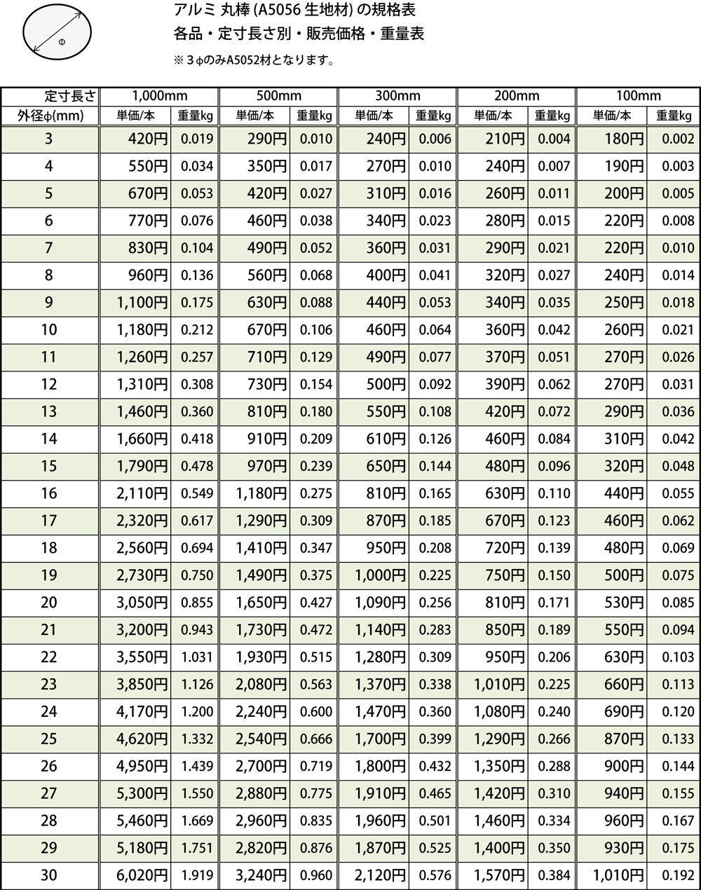 アルミ製丸棒(引抜・押出丸棒)材料(材質5056)生地材、各品形状の