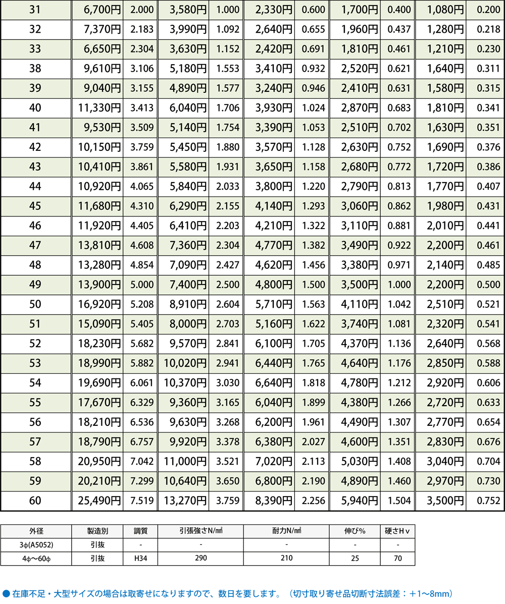 ヤフオクで任意の品形状・定寸長さ・本数を購入可能にするための採用基準単価です。