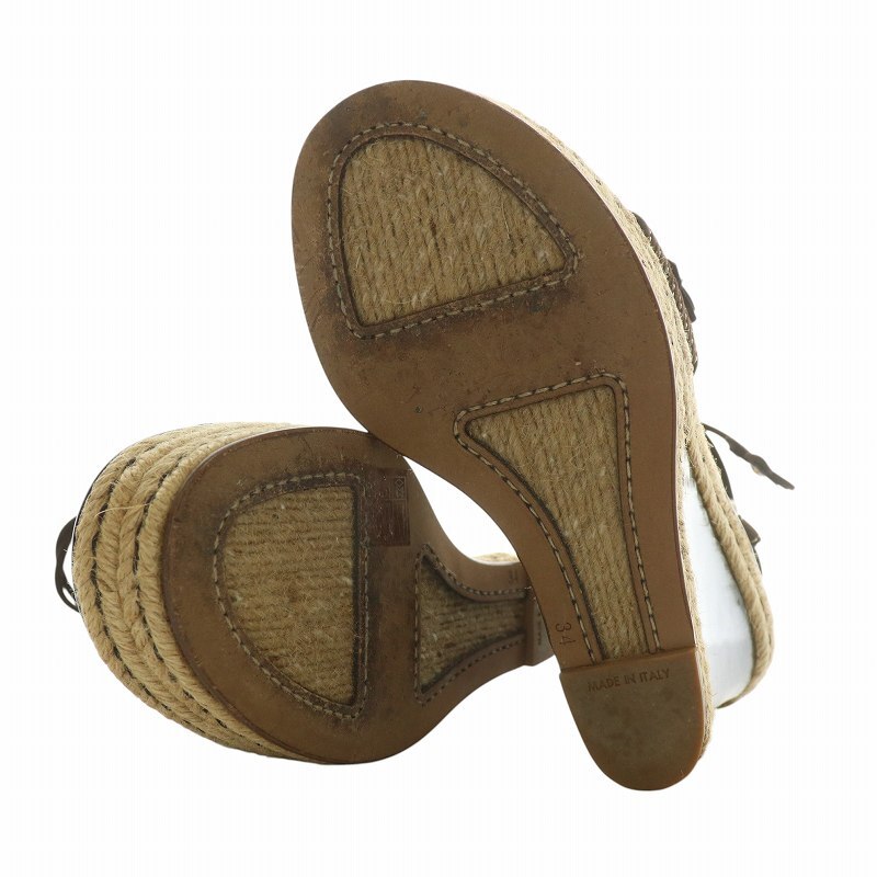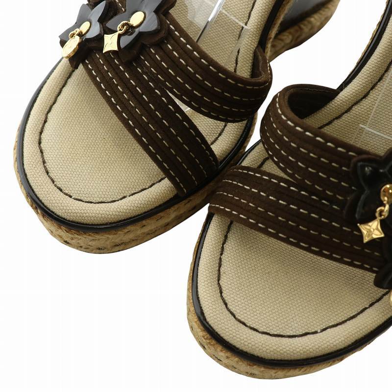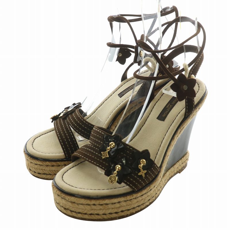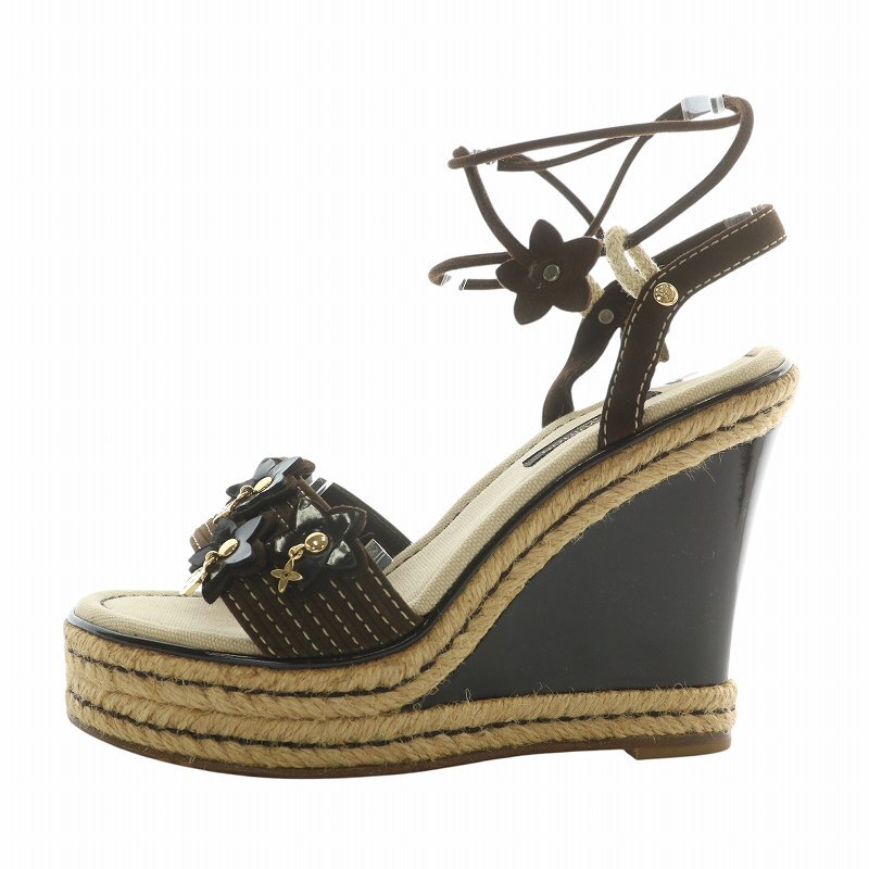 LOUIS VUITTON サンダル エナメル エスパドリーユ ウェッジソール フラワーモチーフ ストラップ 34 21.5cm 茶色 ベージュ
