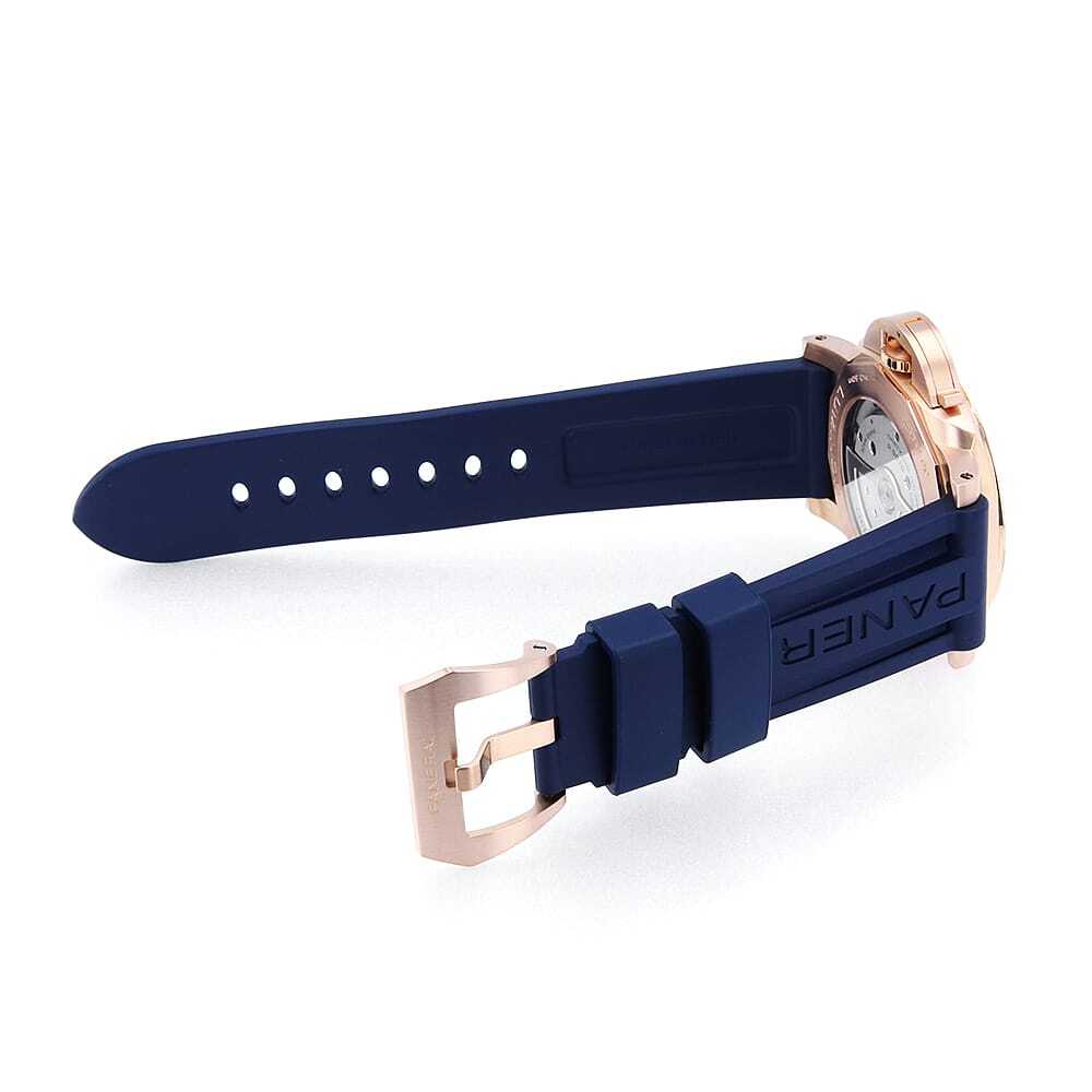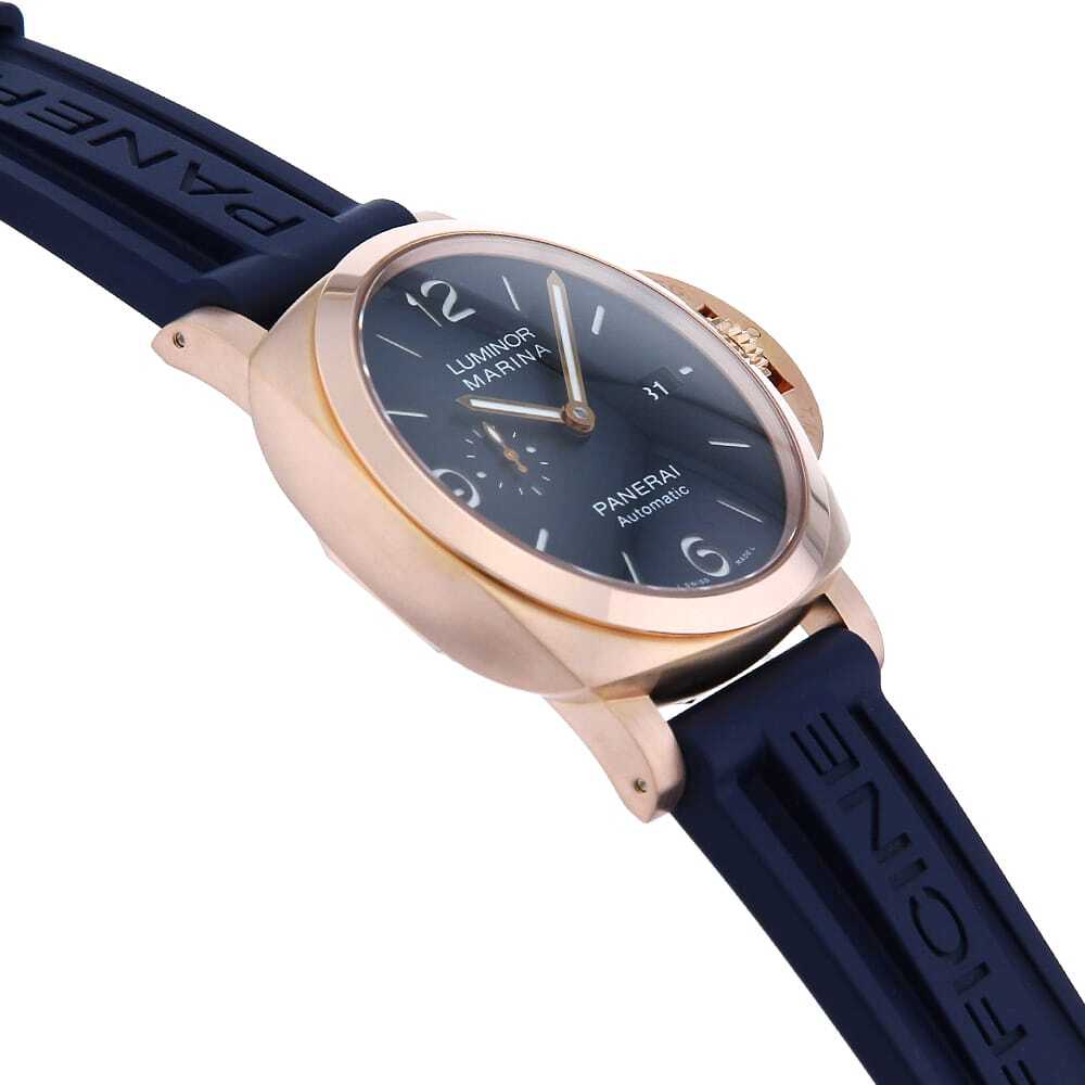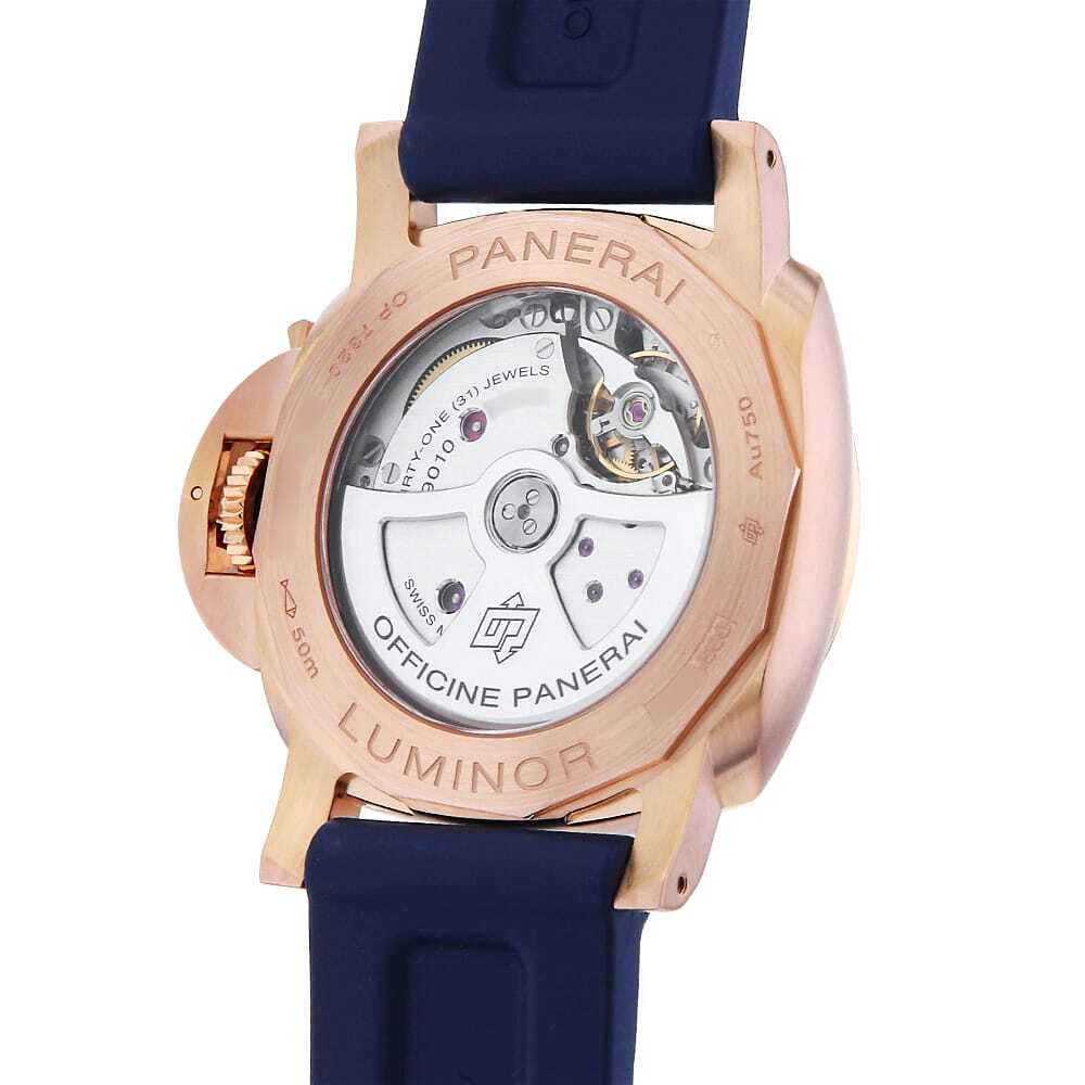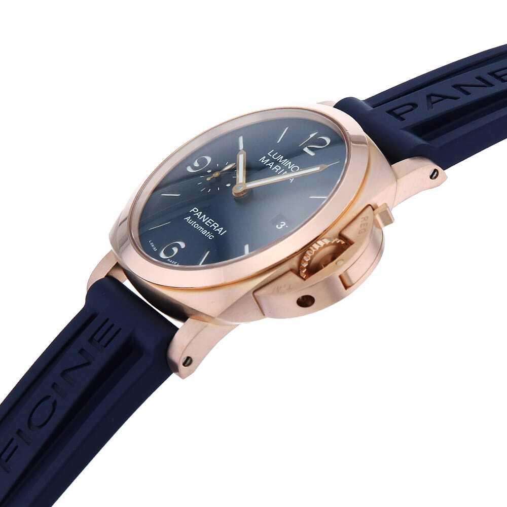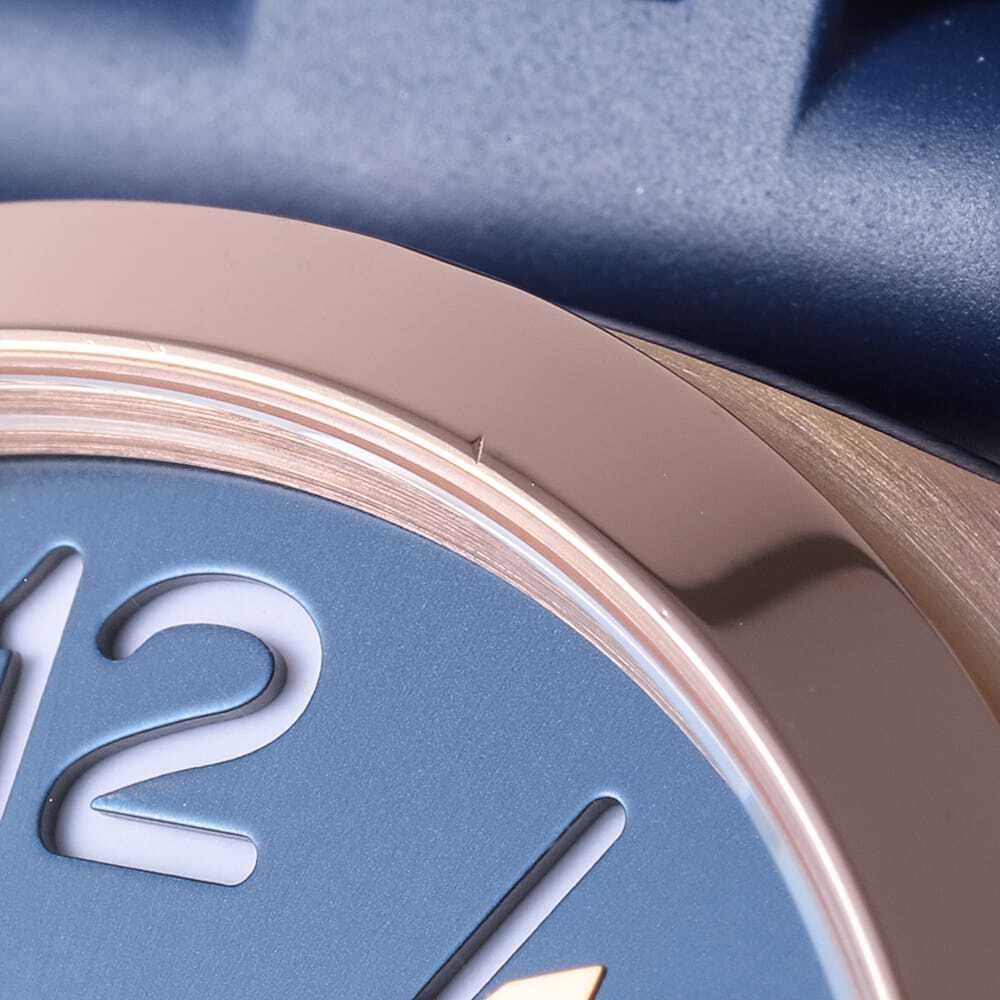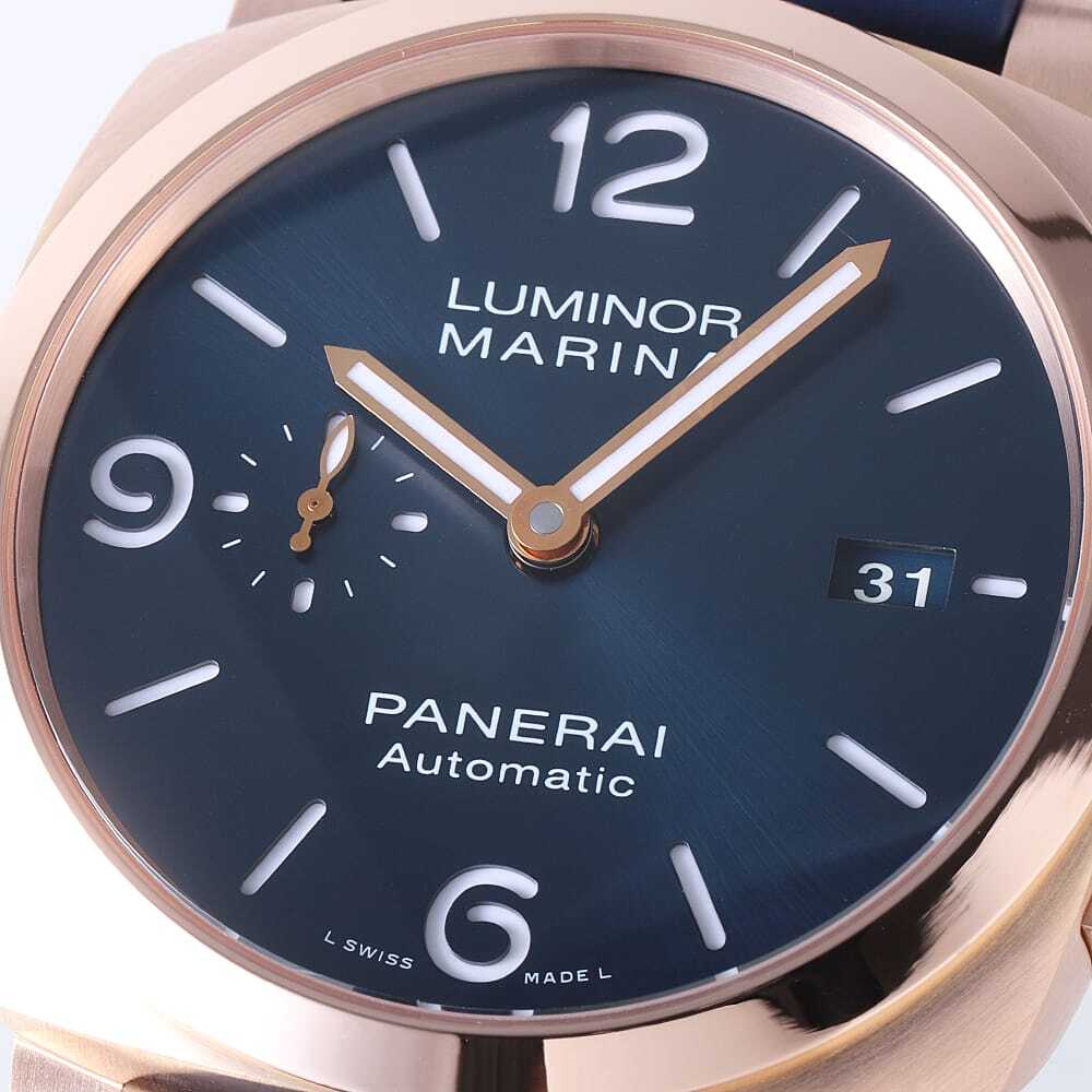 モデル情報 | 過酷な軍事環境での使用を念頭に置き、いかなる条件のもとでも高い性能を発揮する腕時計として 設計されたルミノール。こちらはパネライが独自に開発した特殊な金合金が使用されたモデルです。酸化による変色がしづらく、耐久性が向上しています。ワーリザーブ3日間の自動巻きキャリバーP.9010を搭載しています。派手すぎず落ち着いたデザインはビジネスはもちろん、カジュアル、フォーマルまで洋服を選ばず装着でき、年代を問わず幅広い層に受け入れられています。 |