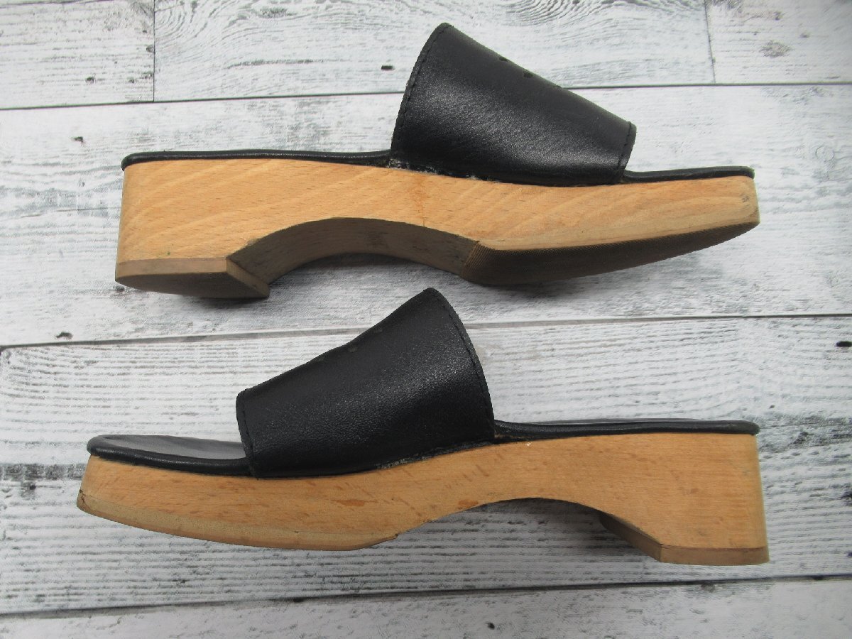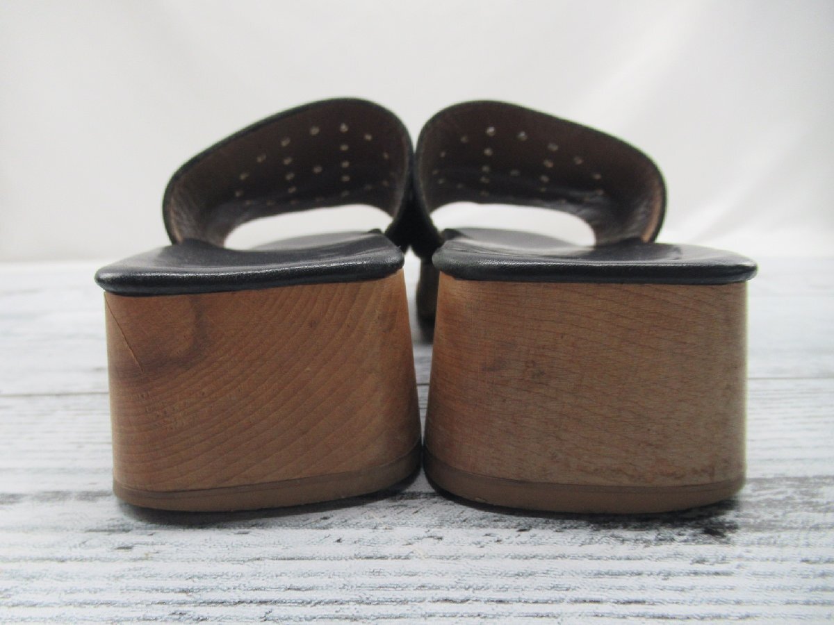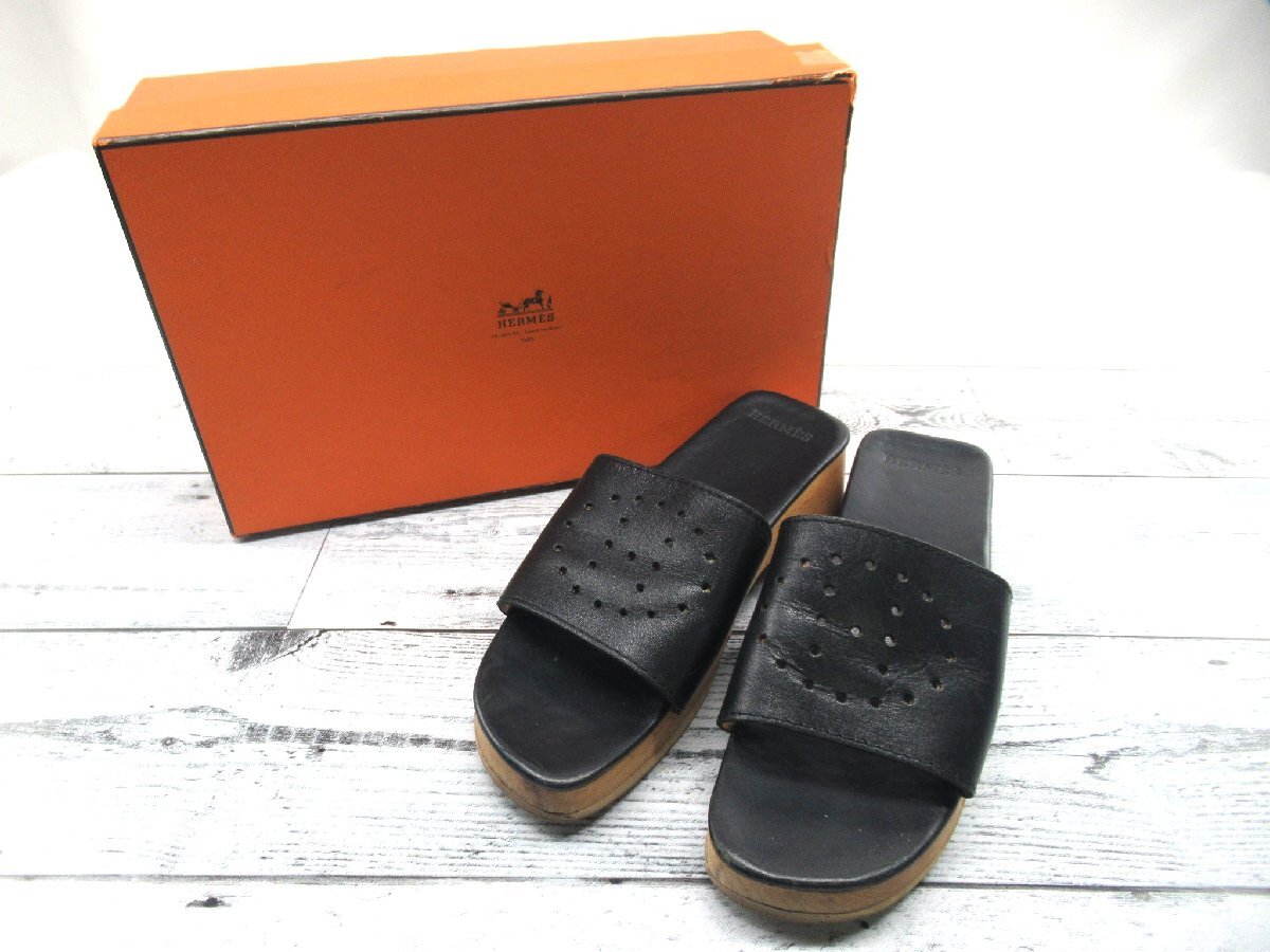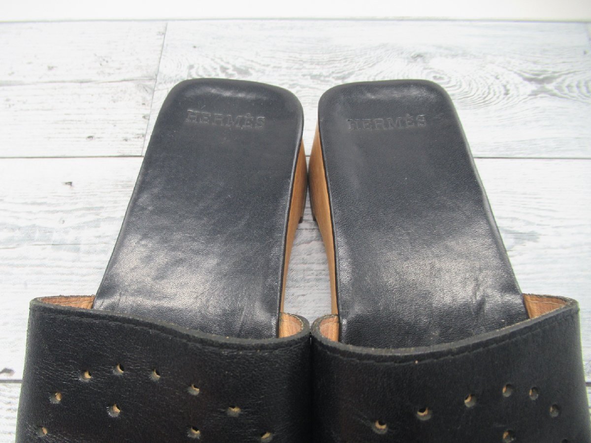 ★【B送900円】2348 HERMES エルメス レザーサンダル ミュール オープントゥ ブラック ウッドソール カットワーク 箱付き 35