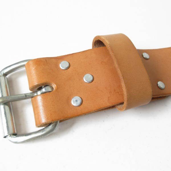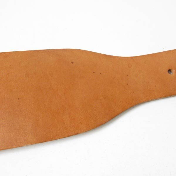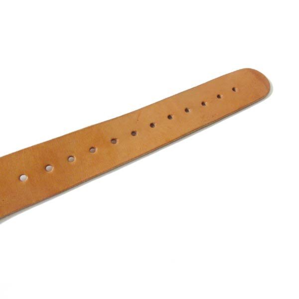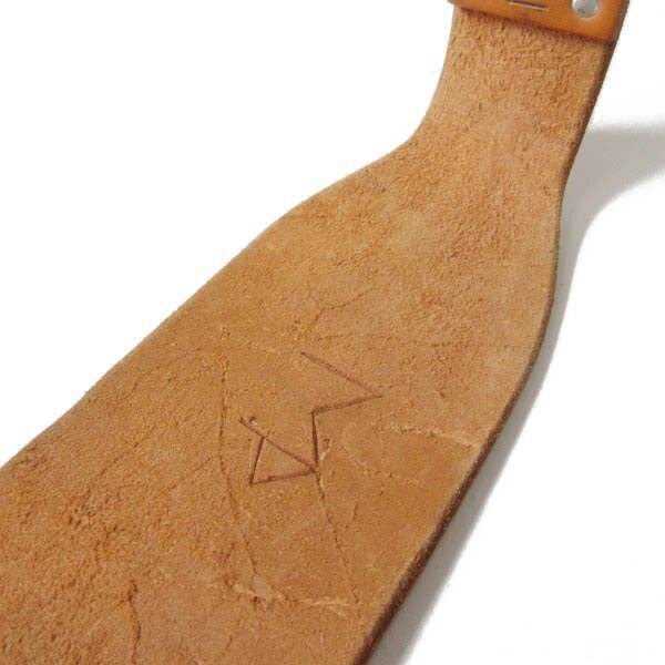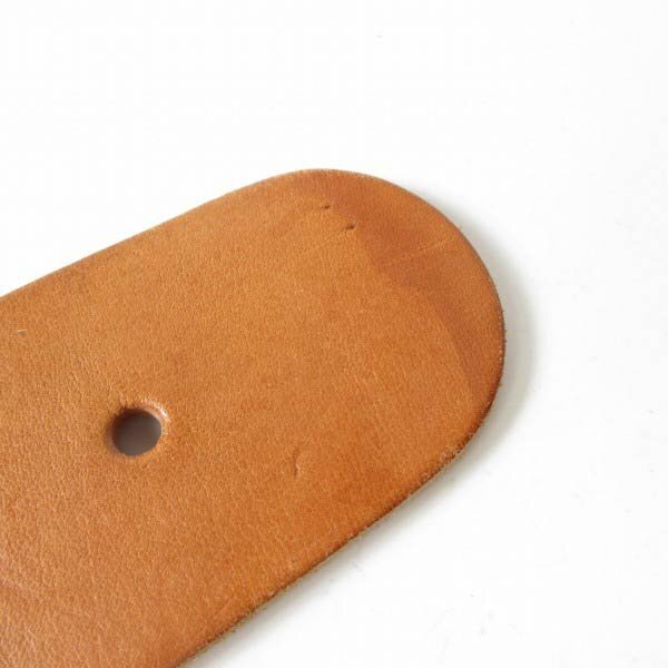裏面に手彫りの刻印、ヌメ革なので水染みのような部分や汚れなどはありますが、ベルトホール周りに使用感のないほぼ新品状態です。