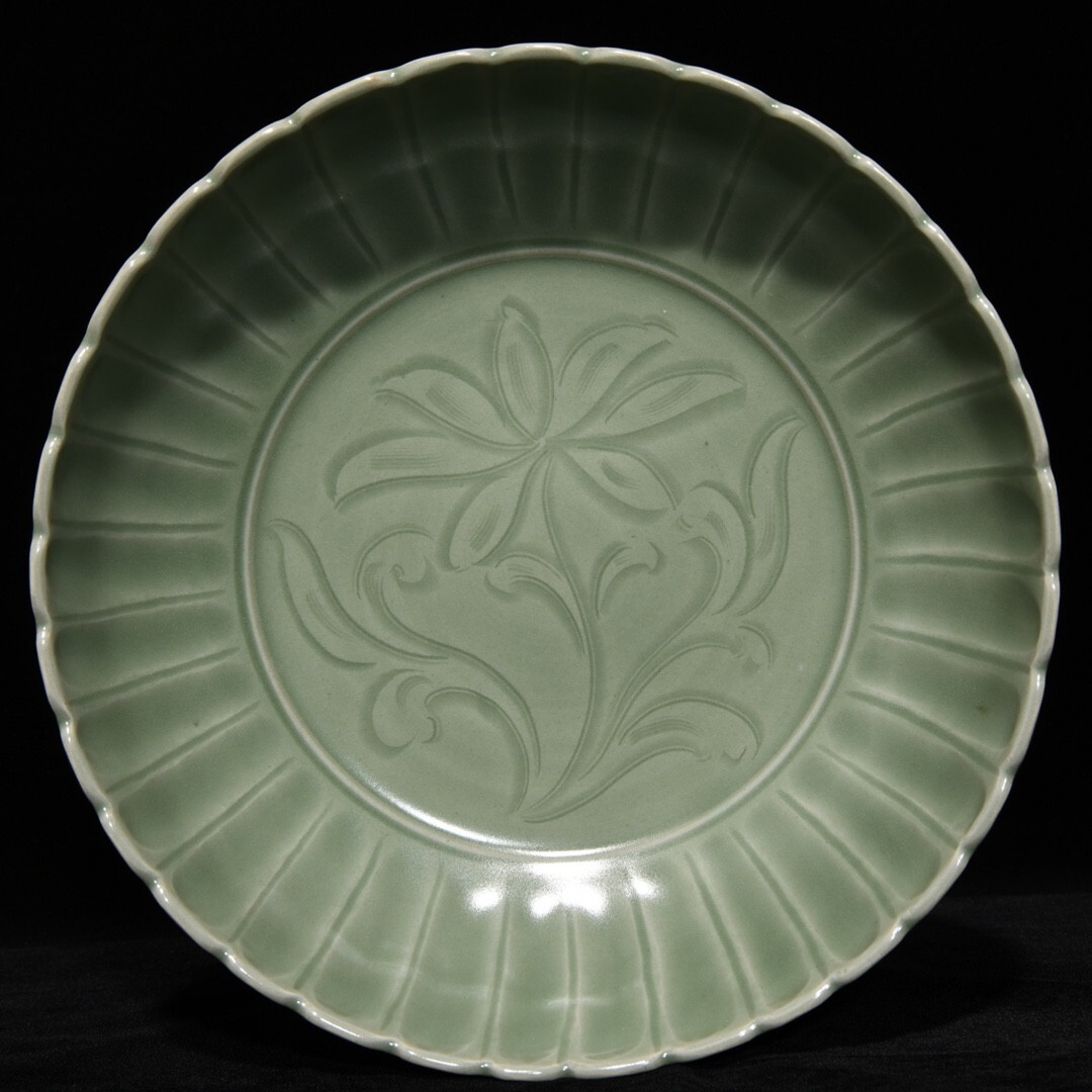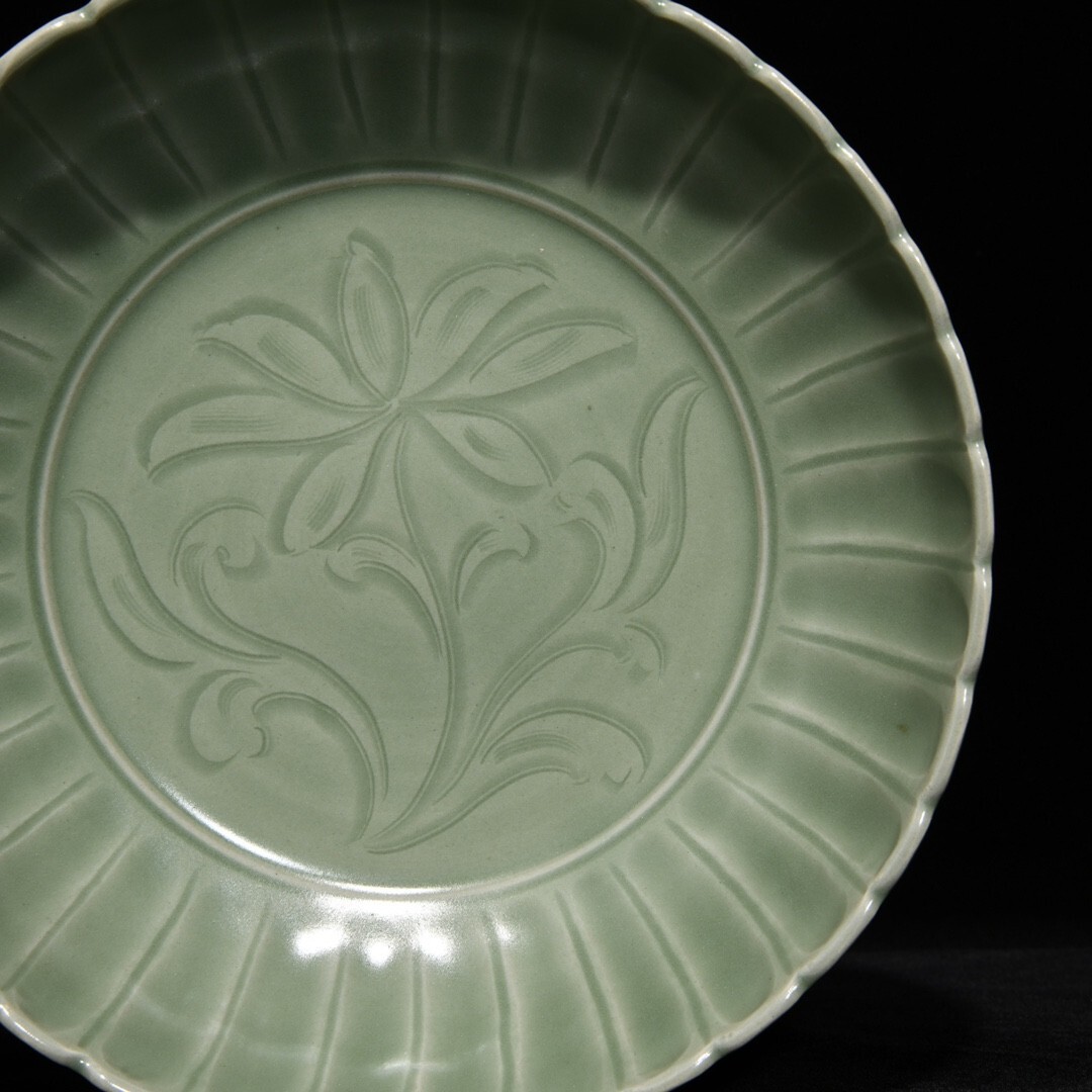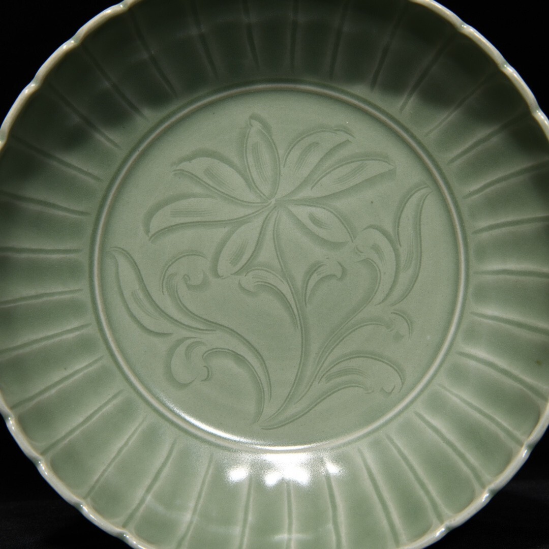 「宋 龍泉窯 陶磁器 刻花花卉紋 果盤」染付 置物 擺件 古賞物 中国古美術 旧蔵出