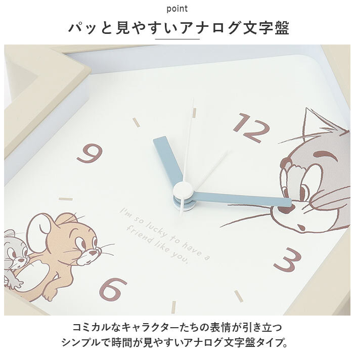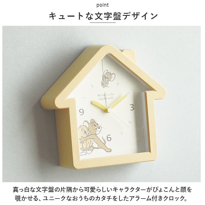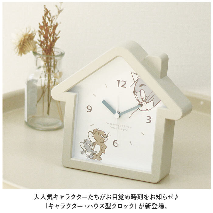 商品説明 | ・・大人気キャラクターたちがお目覚め時刻をお知らせ♪「キャラクター・ハウス型クロック」が新登場。 ・【キュートな文字盤デザイン】 ・真っ白な文字盤の片隅から可愛らしいキャラクターがぴょこんと顔を覗かせる、ユニークなおうちのカタチをしたアラーム付きクロック。 ・【パッと見やすいアナログ文字盤】 ・コミカルなキャラクターたちの表情が引き立つ、シンプルで時間が見やすいアナログ文字盤タイプ。 ・【アラームですっきりウェイクアップ】 ・ピピピピッ、ピピピピッと可愛く鳴り響くアラームで、早起きの苦手なお寝坊さんでも毎朝の目覚めがスッキリ爽快。 ・【おやすみ時間を妨げない連続秒針】 ・快適なリラックスタイムを妨げない「静音連続秒針」を採用。秒針のカチコチ音が気になってしまう方や、自室や書斎でテレワークをされる方にもオススメ。 ・【置き・掛け兼用】 ・テーブルやベッドサイドにさりげなく飾れるのはもちろん、背面の「フック穴」で壁掛けにもできる「置き・掛け兼用」タイプ。 ・【らくらく電池交換】 ・単3形乾電池1本使用。電池ボックス内には電池取り出しのためのテープ生地が付いていて、電池交換がとっても簡単!(※電池は別売りです。) ・【ご家族みんなで使いやすい♪】 ・シンプルで誰にでも使いやすく、お仕事で毎朝早起きされる方や、お子さまの目覚まし用に最適! ・【ギフトにぴったり、ほのぼのデザイン】 ・仲良くケンカする姿が可愛らしい「トム&ジェリー」や、無垢で温かみのある表情に癒される「ミッフィー」など、世界中で愛されているキャラクターのデザインをラインナップ。 |