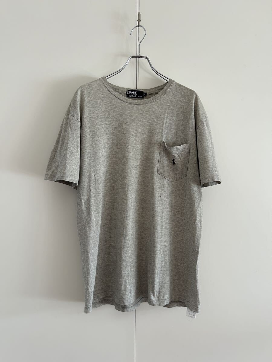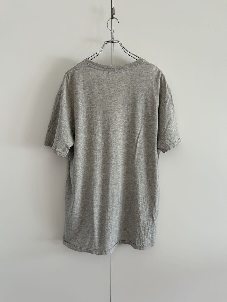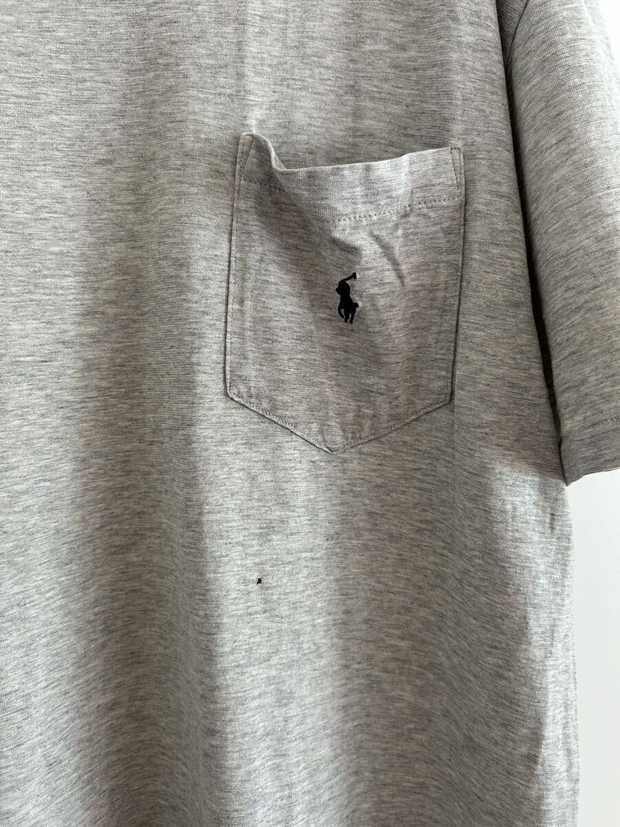 90年代の空気を纏ったシンプルな一枚。杢グレーのボディに胸ポケットと小さなポニー刺繍。日本製ならではの質感とシングルステッチのディテールが魅力です。