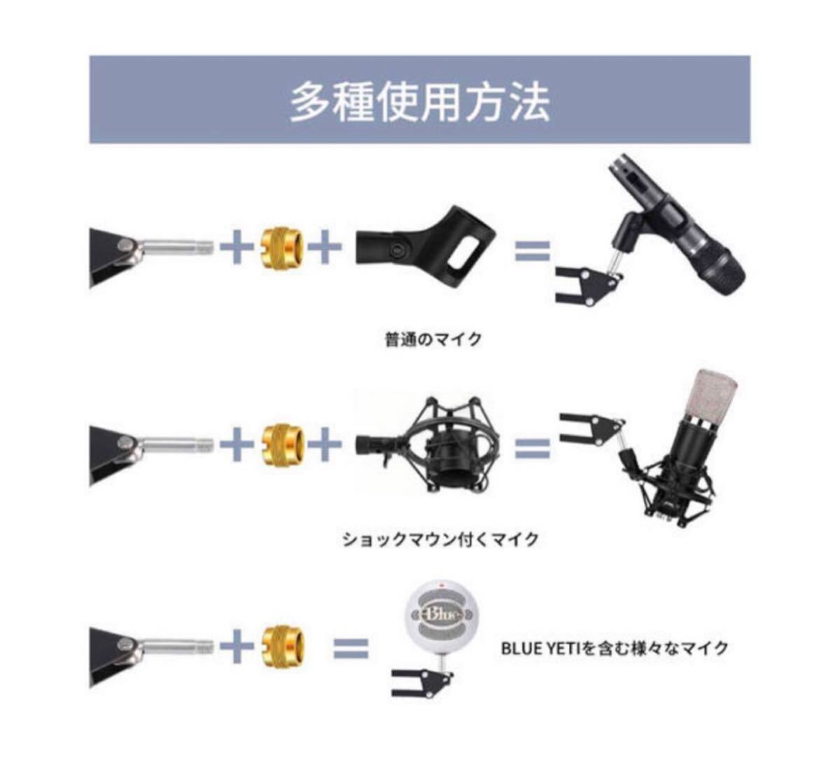 ★【幅広い汎用性】弊社のプラスチック製マイククリップは、直径6 cm以下のマイクをサポートしています、弊社のマイクスタンドはネジアダプタを1本多く備え、ネジアダプタを接続することで、市販されている様々なマイクに対応可能です。コンデンサーマイクの取り付けに最適。ご自身の収録スタイルに合わせてカスタマイズできるマイクスタンドです。
