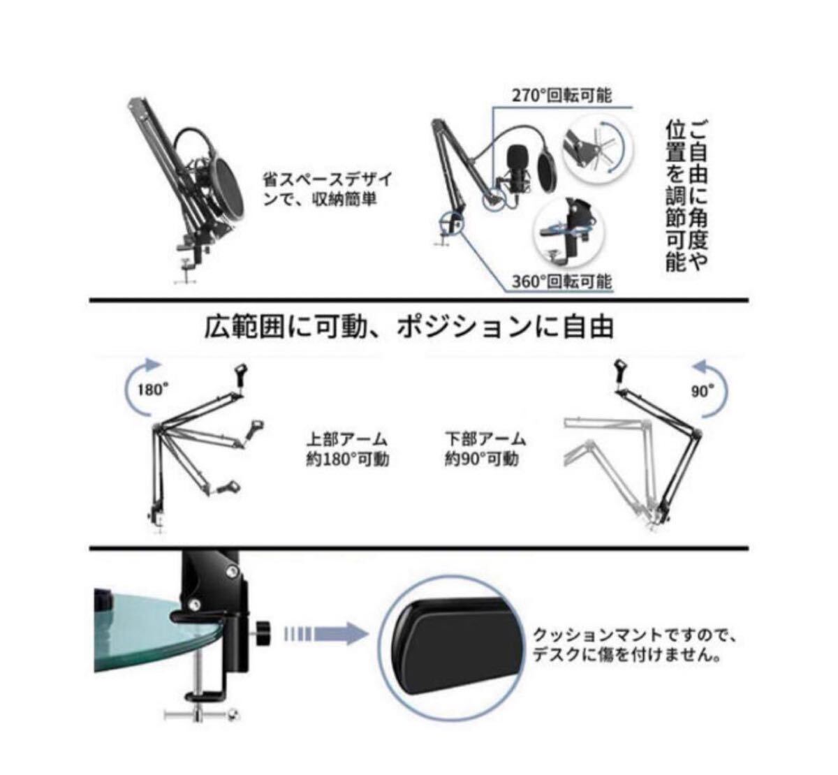 ★【角度調整可能&便利な折り畳み機能】強化されたテーブル用クランプはどんな場所にも柔軟で固定にしっかり締め付けられます。使用するときは自由に角度や位置を調節でき、使用後はアームを動かすだけで簡単に片付けられます。上部アーム約180°、下部アームは約90°可動する構造で使いやすい角度に調節可能です。加えて、ポップガードは360°で自由自在に可動するフレキシブルアーム式を採用しており、使い勝手に優れたモデルです。折り畳み式マイクスタンドは簡単に折り畳んで収納でき、便利に持ち運びます。