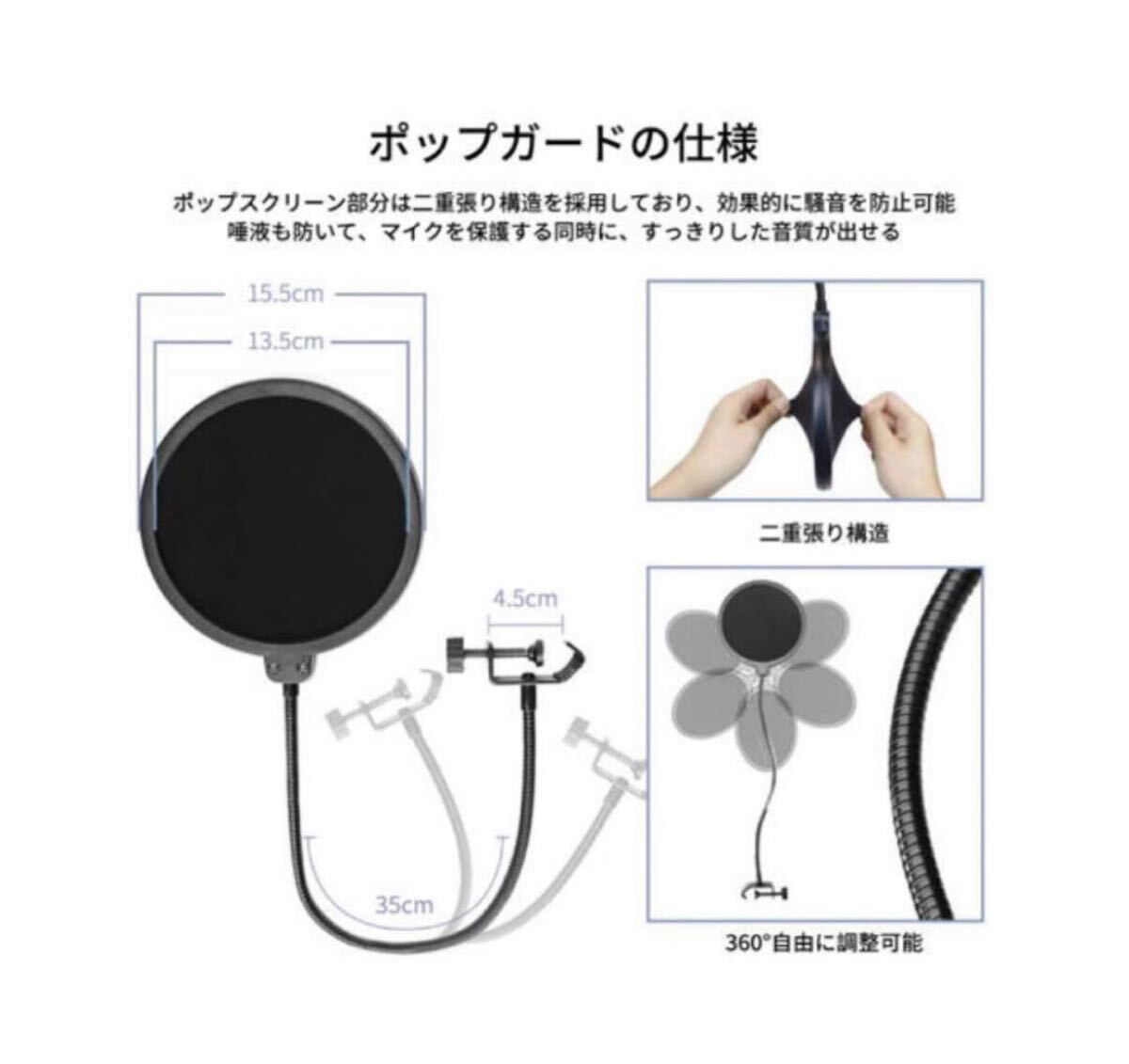 ★【ポップノイズ防止】ポップスクリーン部分は二重張り構造を採用しており、効果的に騒音を防止することができます。それに唾液も防いて、マイクを保護する同時に、すっきりした音質が出せます。スタジオなど様々なシチュエーションにも活躍です。また、繊細なコンデンサーマイクを湿気から守る役目も果たしています。金属製ショックマウントも机や床の振動からマイクの良音を守りマイク固定用ゴムで周りの振動を吸収するため、よりクリアな音が取れます。