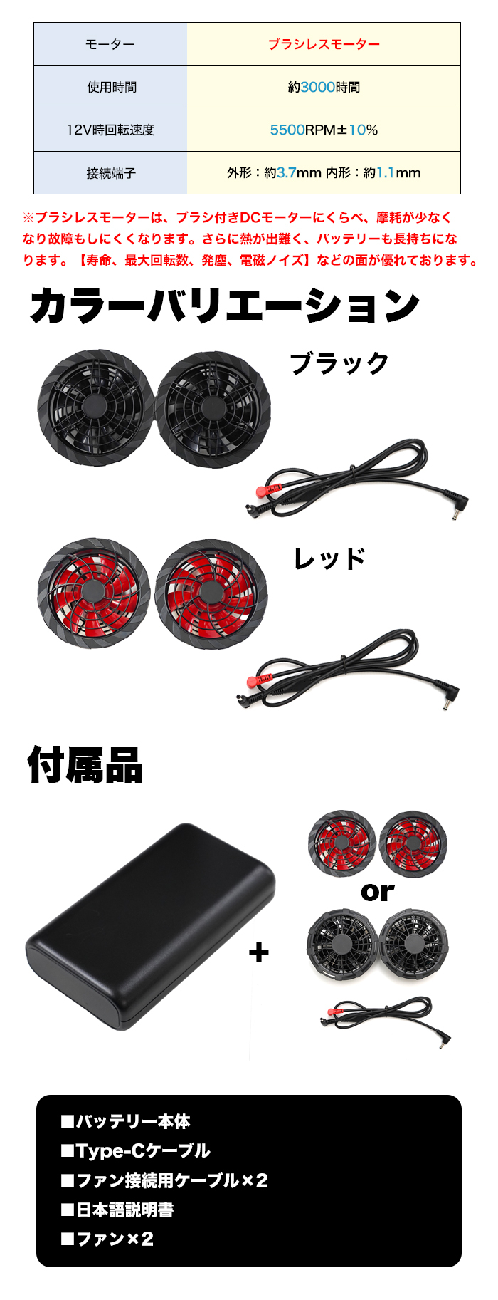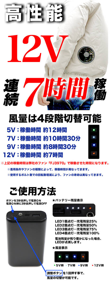| ■注意事項 『9V・12V』で動作保証が取れていないファンに関してましては、 ファンの故障原因になりますので『5V・7V』のみで必ずご使用ください。 ※尚、電圧(POWER)切替時、瞬間的に『9V・12V』で動作することに関しましては、問題ありません。 ■下記ファンに関しましては『9V・12V』動作での確認が取れているファンとなります。 --------------------------------------- メーカー:(株)バートル(エアクラフト) 型番:AC240/AC241 (ファンユニット) 型番:AC270/AC271 (ファンユニット) --------------------------------------- ■下記ファンに関しましては接続プラグのサイズが5mmとなっており、 当商品(入力端子3.5mm)に接続する事が出来かねるため、 当店で別途販売中の変換プラグを併用して頂ければご使用いただくことが可能ですのでご注意ください。 ※変換プラグ商品番号:FJ5163 --------------------------------------- メーカー:(株)サンエス(空調風神服) 型番:RD9010H (ハイパワーファンセット) 型番:RD9020H (フラットハイパワーファン) --------------------------------------- ※商品画像の適合不可情報及び注意事項を必ずご確認下さい。 ※12V出力に対応していないファンでも本バッテリーをご使用いただくことは可能ですが、 ファン本体が故障しても一切の責任を負いかねます。 ※当バッテリーをご使用してのファンの故障に関しましては、保証対象外となります。 ■入力 ・DC 5V 2A max(USB Type-C) ■出力 ・DC 12V (稼働時間:約7時間) ・3.5mmミニプラグ DC 5V / 7V / 9V / 12V ■内蔵電池:リチウムポリマーバッテリー ・電池容量:16,000mAh(定格出力:9,600mAh) ■本体サイズ:約117mm×約68mm×約27mm ■重さ:約318g ■使用温度:0℃?60℃ ■充電時間:付属ケーブル 約6時間 ※2A対応のACアダプター等で充電した場合です。 ■セット内容 ・バッテリー×1 ・充電用TYPE-C USBケーブル×1 ・日本語説明書×1 ■PSEマーク(バッテリー) ・PSマークの種類:PSEマーク ・届出事業者名:株式会社 フジコーポレーション ・製品型番:LM840206(FJ9062) ・定格電圧:DC 5V / 7V / 9V / 12V ■保証について ※保証期間は商品到着後6ヶ月以内になります。【バッテリー本体のみの保証となります】 ※保証対象外の項目も御座いますので、同封の保証書を必ずお読み願います。 ■注意事項 ※2022年式以降のバートル製(AC300/AC310)はジャックの形状が異なる為、使用できません。 ※ファン 及び 空調作業服 は付属しておりません。 ※バッテリーの温度が60℃を超えると内蔵のセンサーが働き、動作がストップされます。 その際は、一旦バッテリーを冷まして頂くと再度使えるようになります。 |