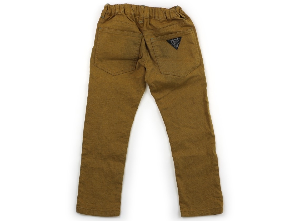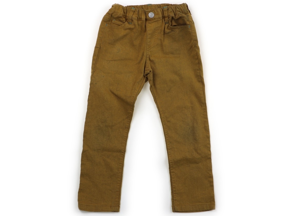 ウエストは総ゴム。ポリウレタン配合デニムパンツです。左ポケット入り口に黒い汚れ、腹部から足にかけて複数のシミあり。膝に黒っぽさが見られます。外遊びにいかがでしょうか。