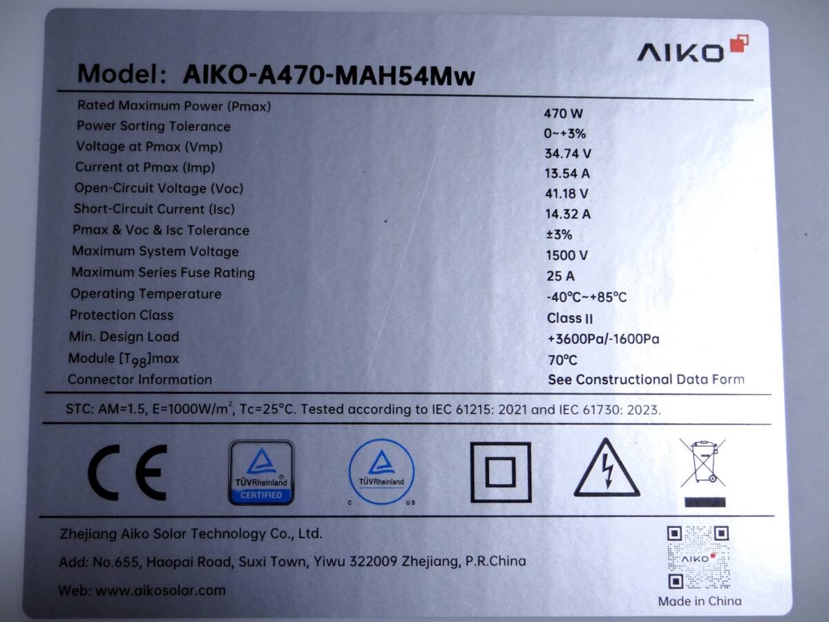 aiko 470 N型ABC単結晶太陽光パネル A470-MAH54MW   <3枚あります>