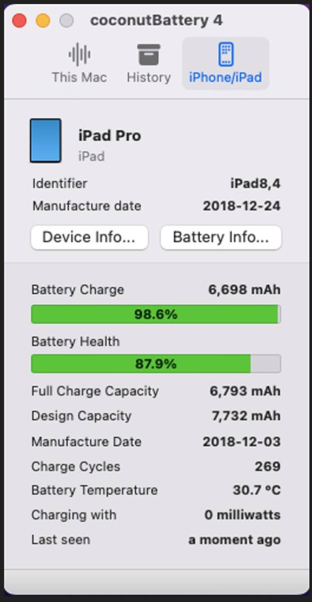 Mac Bookにつなげてアプリで確認したところ、健康状態は87.9%とでました。