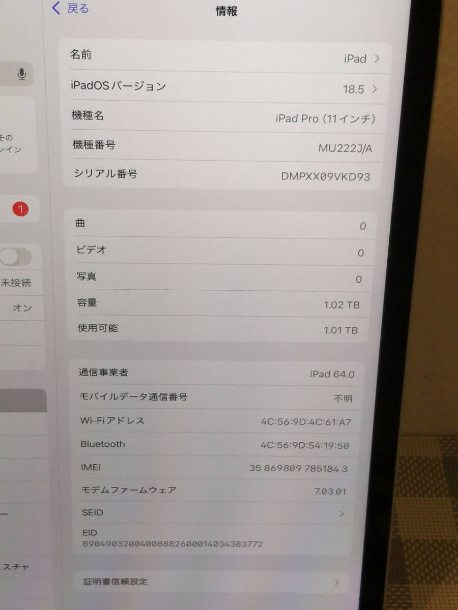 Apple iPad Pro 11インチ(第1世代) Cellular 1TB シルバー (国内版SIMロックフリー) MU222J/A です。