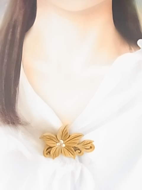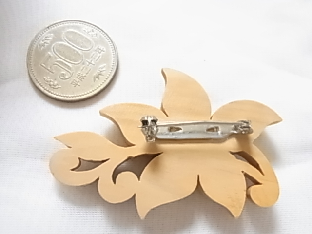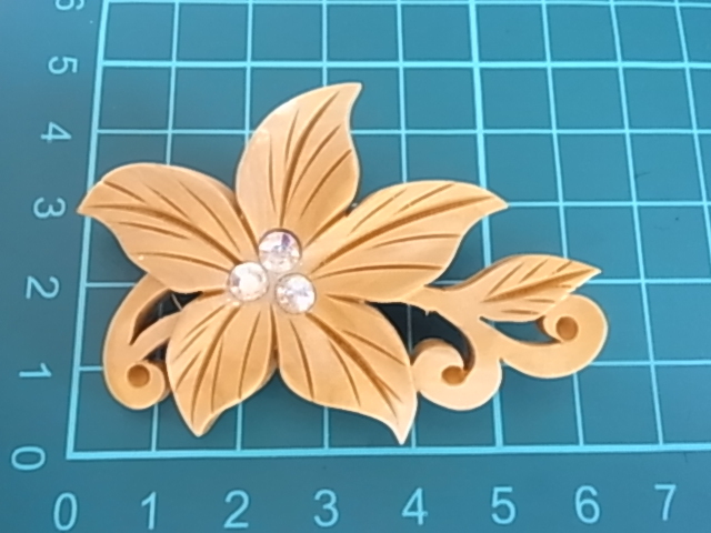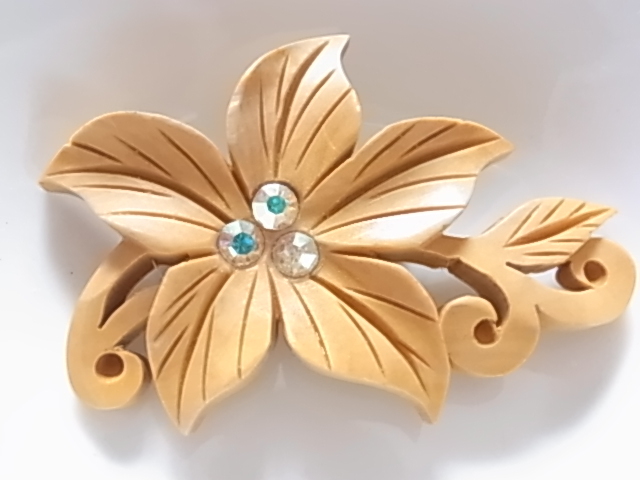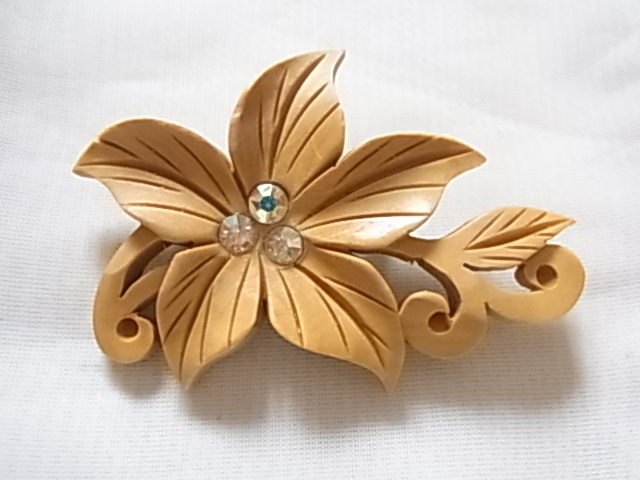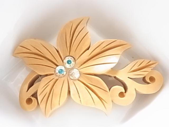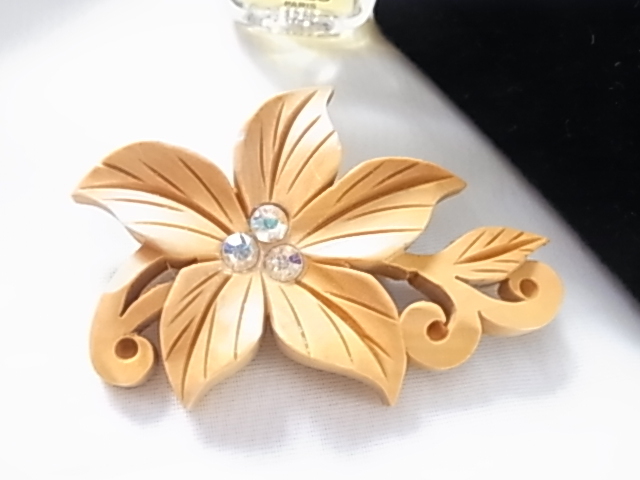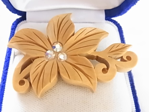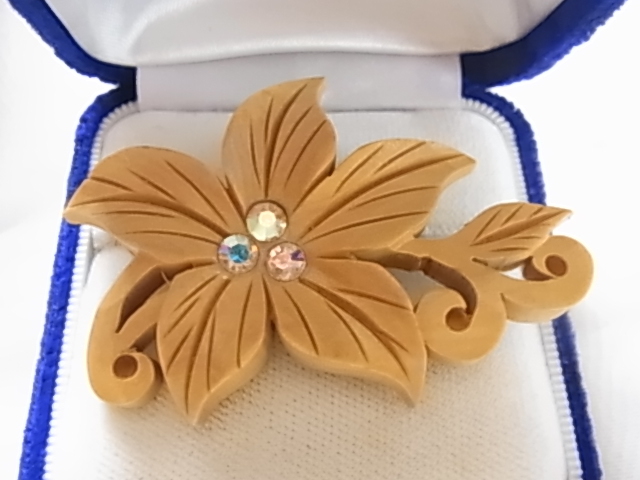 ビンテージ/ヴィンテージ 伝統工芸 柘植 つげ 木製 お花デザイン 3粒のラインストーン付きで輝く 昭和レトロの素敵なブローチ♪♪